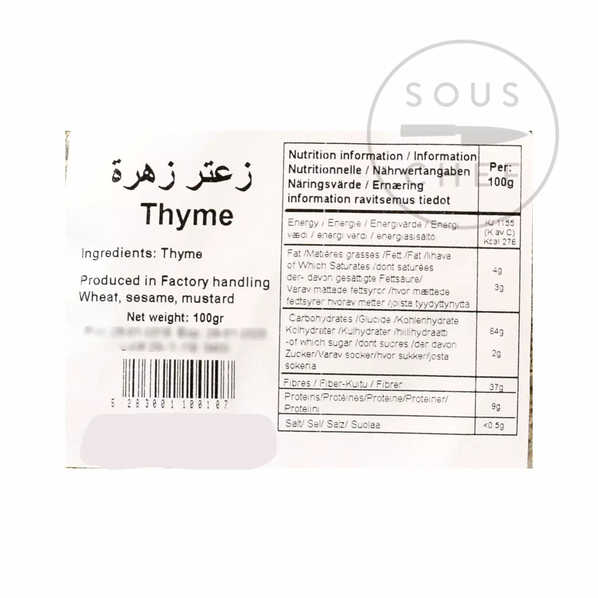 Ingredients: thyme. Produced in a factory that also handles wheat, sesame and mustard.