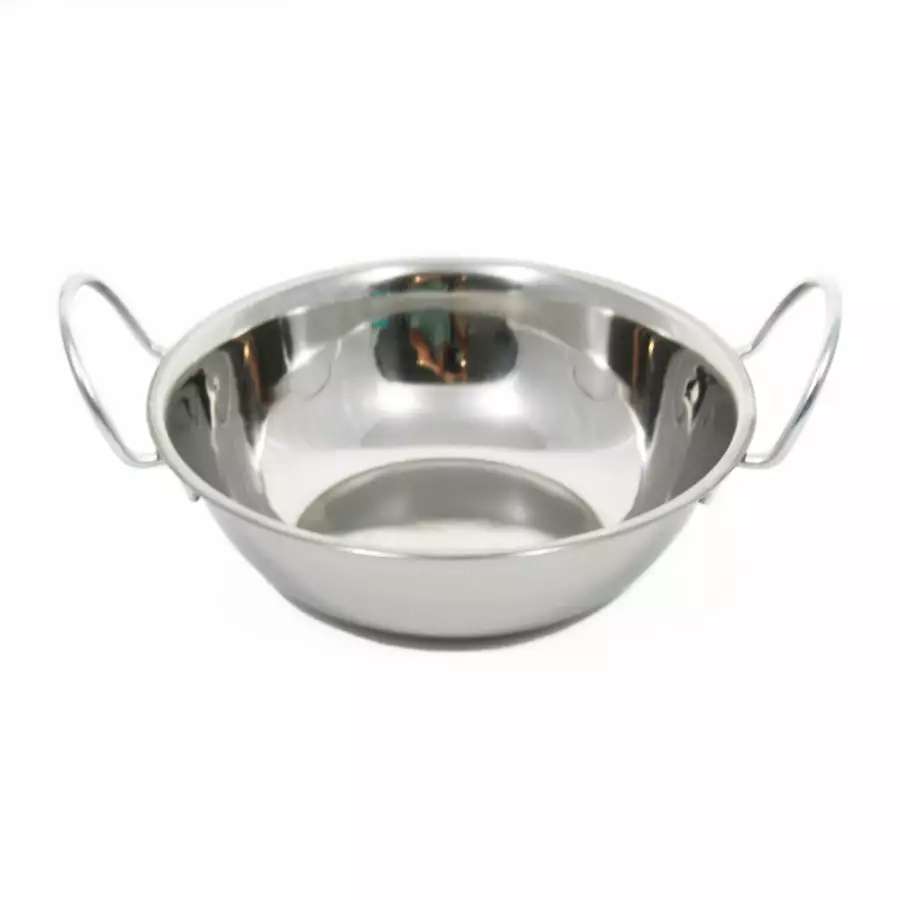 This stainless steel balti dish is the perfect dish for serving Birmingham’s most famous curry — the balti. The balti is most probably named after the dish it is cooked in, an Urdu word meaning ‘bucket’. These balti dishes bring the look of authentic Indian cooking vessels to your table.