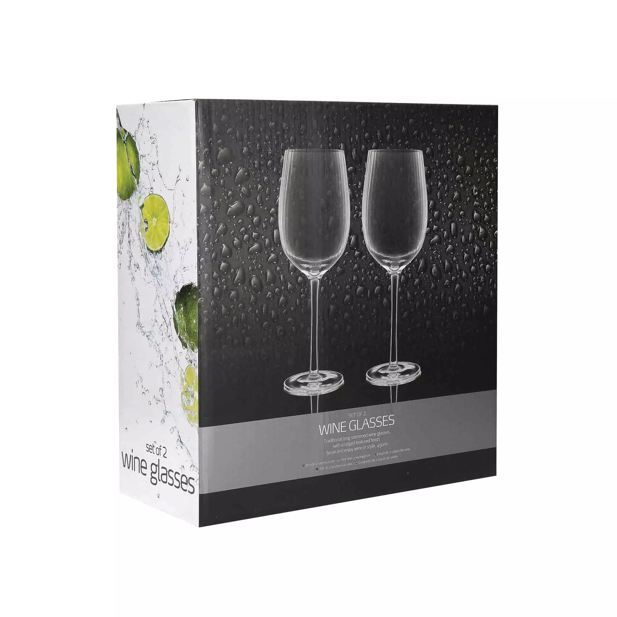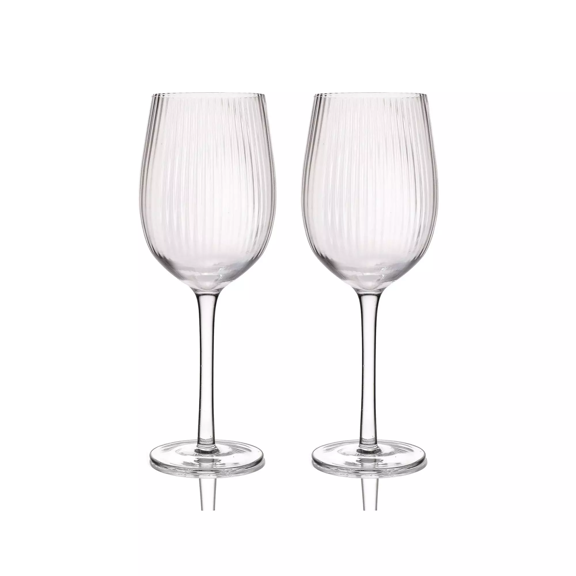 The generous 450ml glasses have a subtle vertical rib pattern, and stand on elegant tall glass stems.