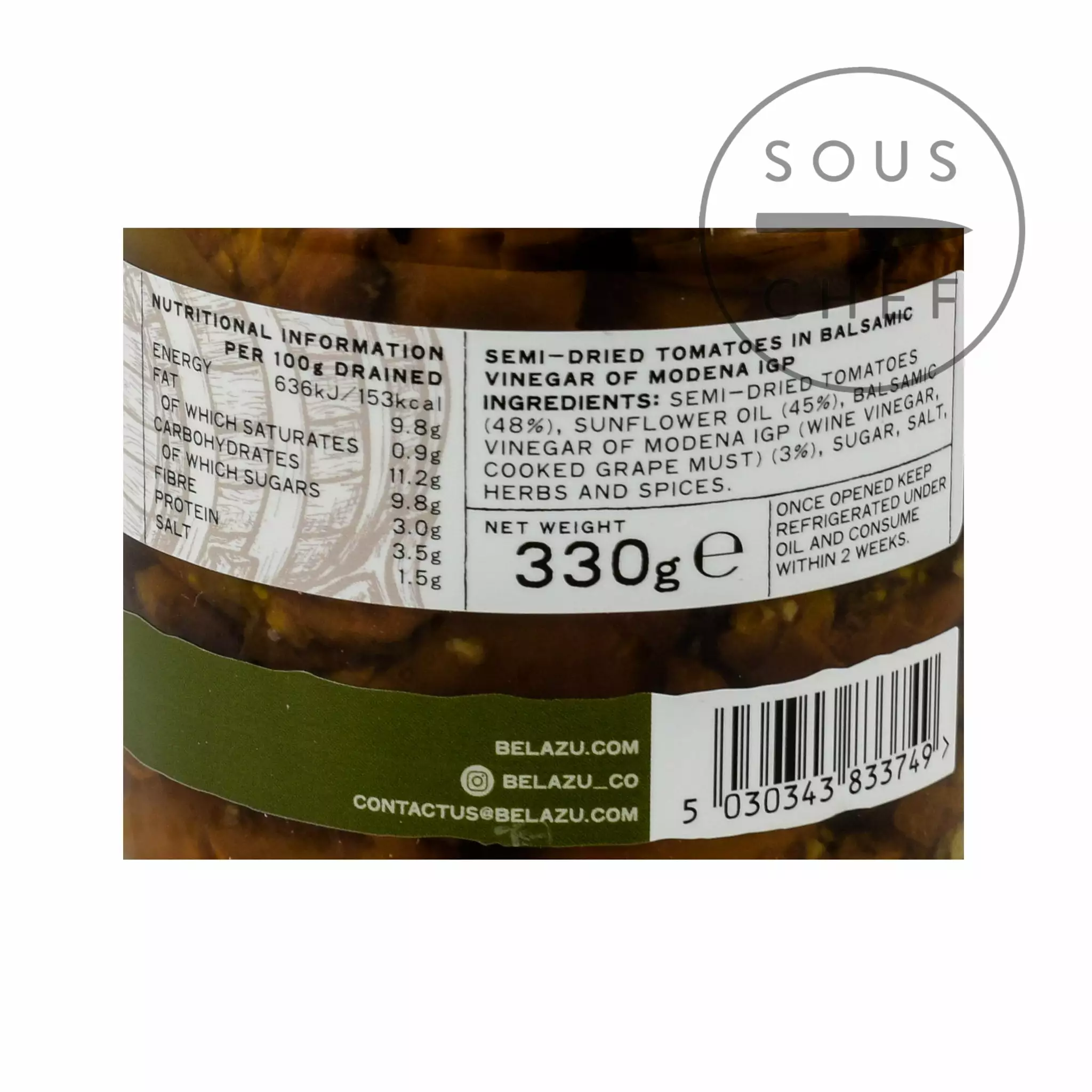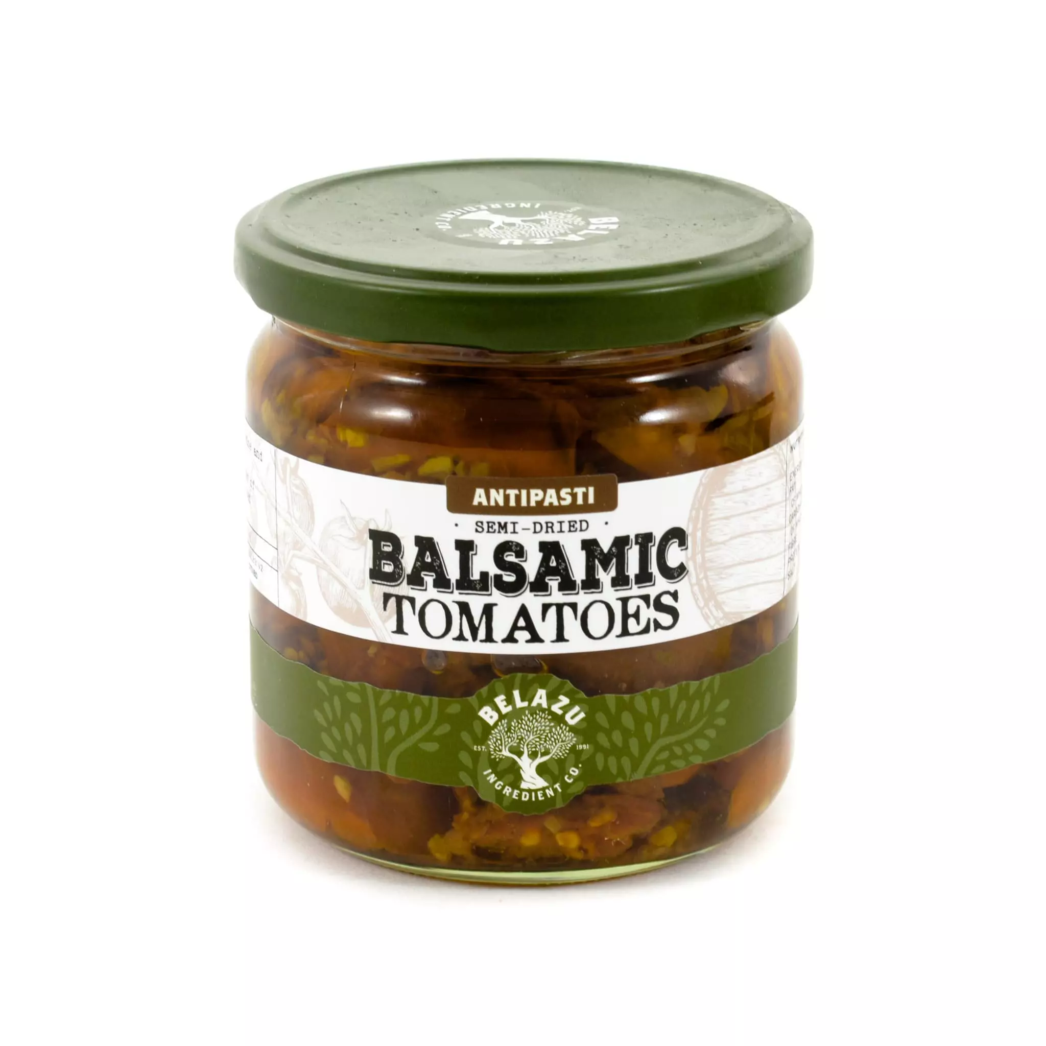 Belazu balsamic tomatoes are fully ripened on the vine, then slow roasted and coated in balsamic vinegar of Modena. The tomatoes are then dried. The full process creates sweet, rich, sticky tomatoes packed full of intensified Meditteranean flavours.