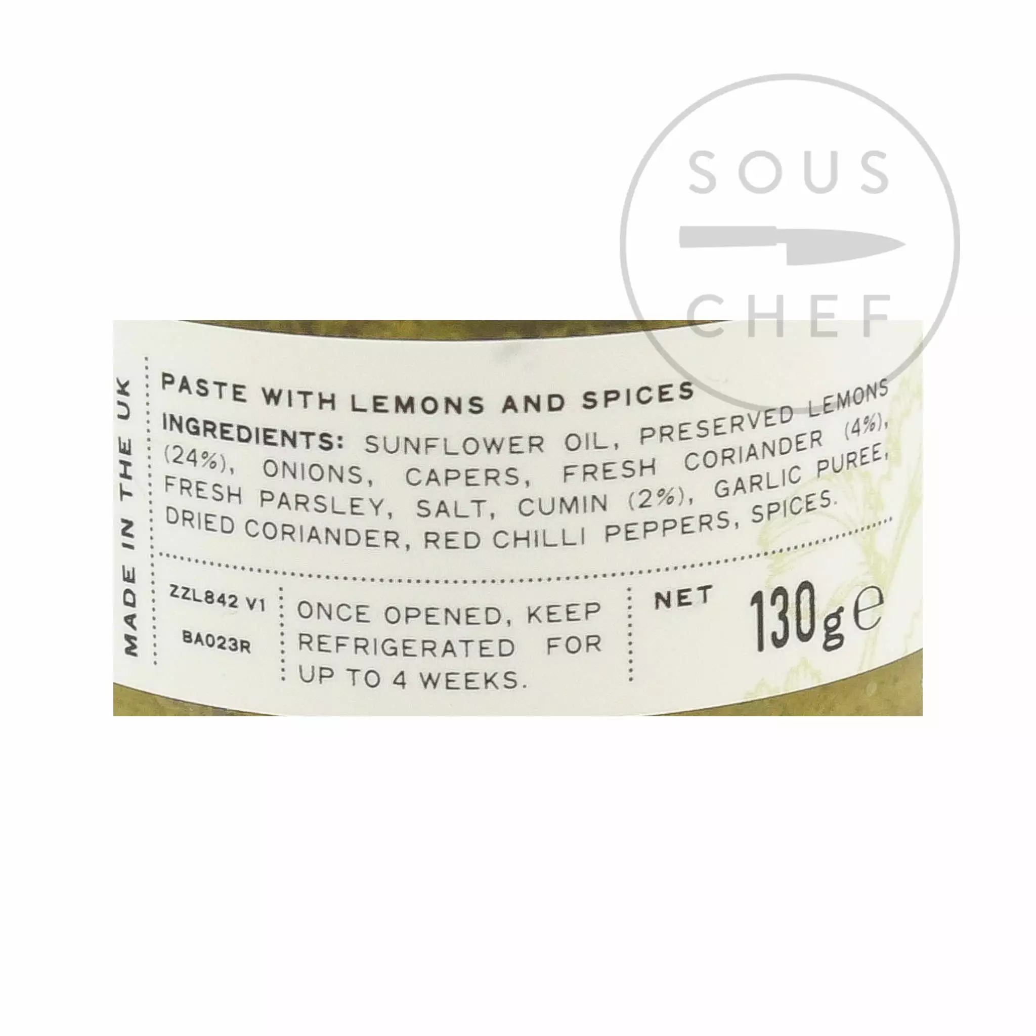 Ingredients: sunflower oil, preserved lemons (24%), onions, capers, fresh coriander (4%), fresh parsley, salt, cumin (2%), garlic puree, dried coriander, red chilli peppers, spices.