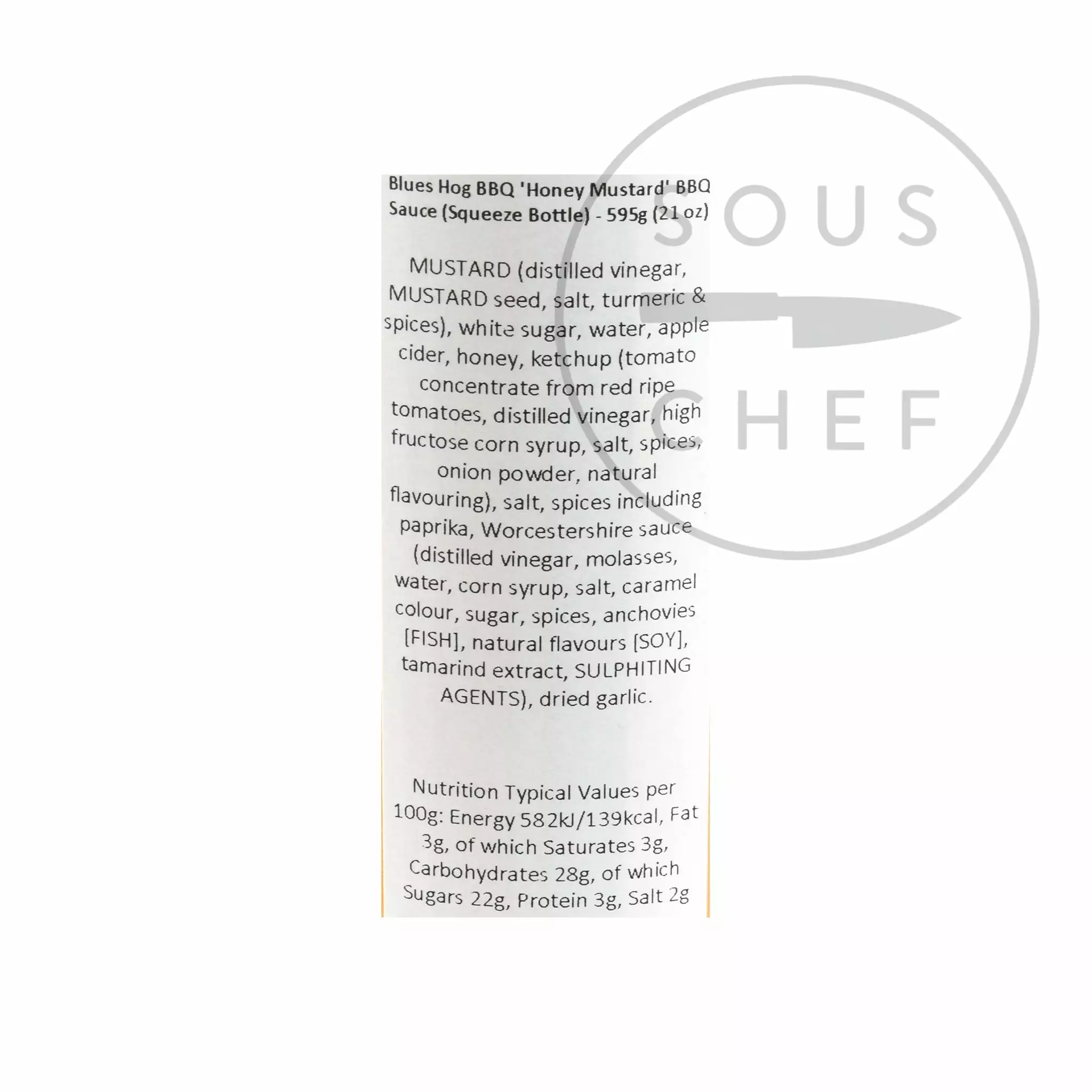 Ingredients: mustard (distilled vinegar, mustard seed, salt, turmeric & spices), white sugar, water, apple cider, honey, ketchup (tomato concentrate from red ripe tomatoes, distilled vinegar, high fructose corn syrup, salt, spices, onion powder, natural flavouring). salt, spices including paprika, Worcestershire sauce (distilled vinegar, molasses, water, corn syrup, salt, caramel colour, sugar, spices, anchovies (fish), natural flavour (soy), tamarind extract, sulphiting agents), dried garlic.