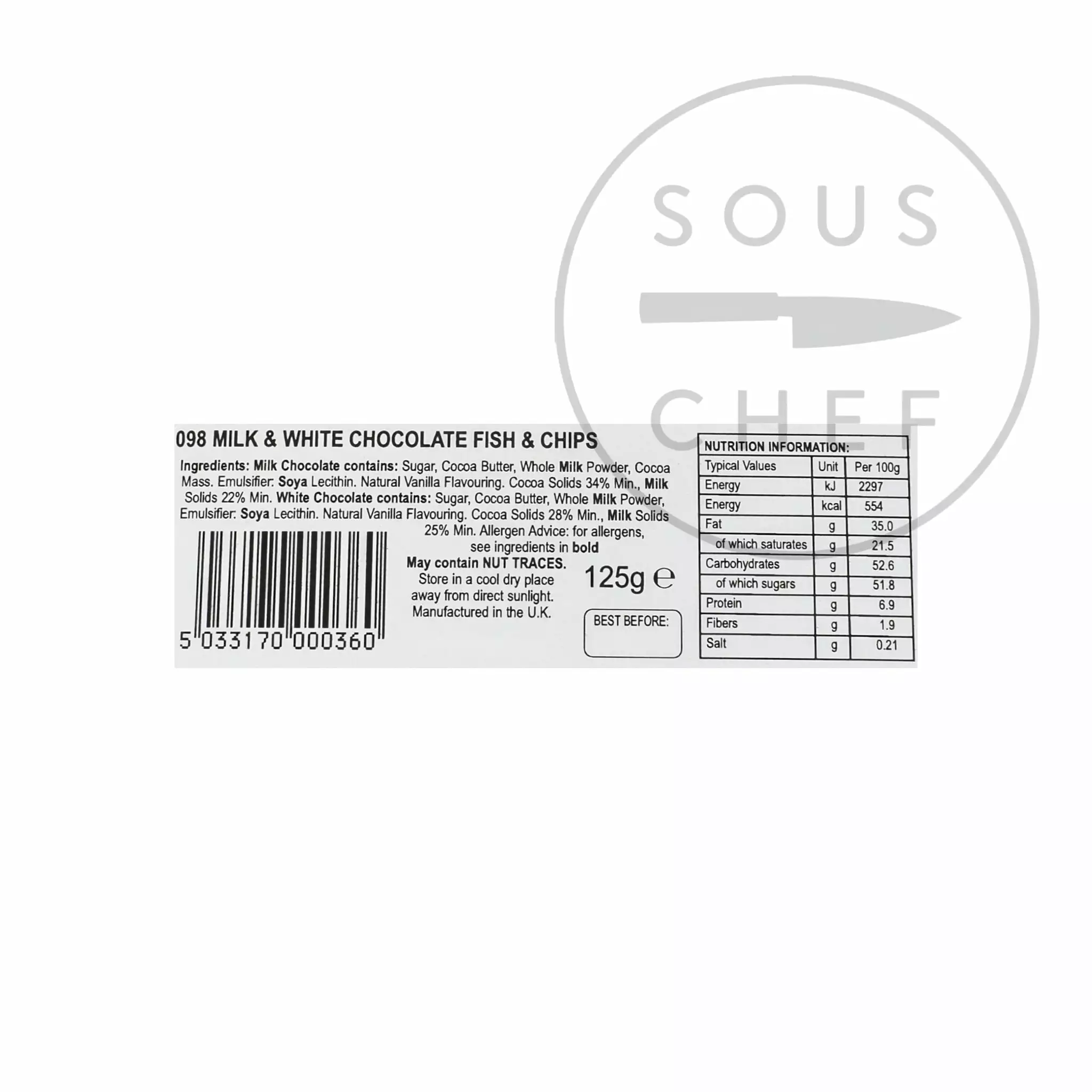 Ingredients: Milk Chocolate contains: Sugar, Cocoa Butter, Whole Milk POwder, Cocoa Mass. Emulsifier: Soya Lecithin. Natural Vanilla Flavouring. Cocoa Solids 34% Min., Milk Solids 22% Min. White Chocolate contains: Sugar, Cocoa Butter, Whole Milk Powder. Emulsifier: Soya Lecithin. Natural Vanilla Flavouring. Cocoa Solids 28% Min:; Milk Solids 25% Min.