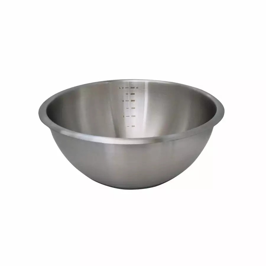 The De Buyer hemisphere mixing bowl is 20cm in diameter and has a capacity of 2.1 litres. A scale is laser-engraved on the inside, so you can see at a glance the volume of ingredients or mixture in the bowl.