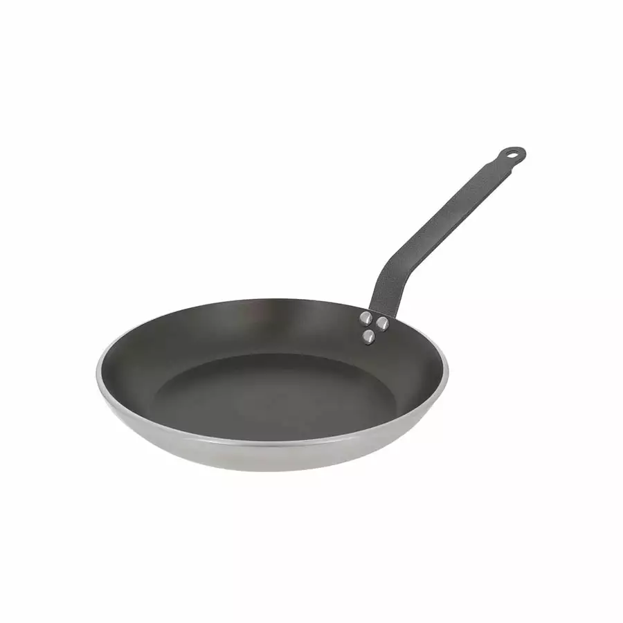 The frying pan has a ‘lyonnaise’ profile – this means there are no sharp, straight edges around the rim, so food slides easily from pan to plate. The inside of the aluminium pan is coated with 5 layers of PFAO-free, PTFE non-stick Choc 5 – De Buyer’s most durable non-stick coating designed for heavy professional use.