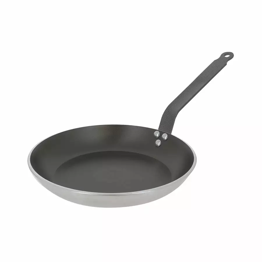 The frying pan has a ‘lyonnaise’ profile – this means there are no sharp, straight edges around the rim, so food slides easily from pan to plate. The inside of the aluminium pan is coated with 5 layers of PFAO-free, PTFE non-stick Choc 5 – De Buyer’s most durable non-stick coating designed for heavy professional use.