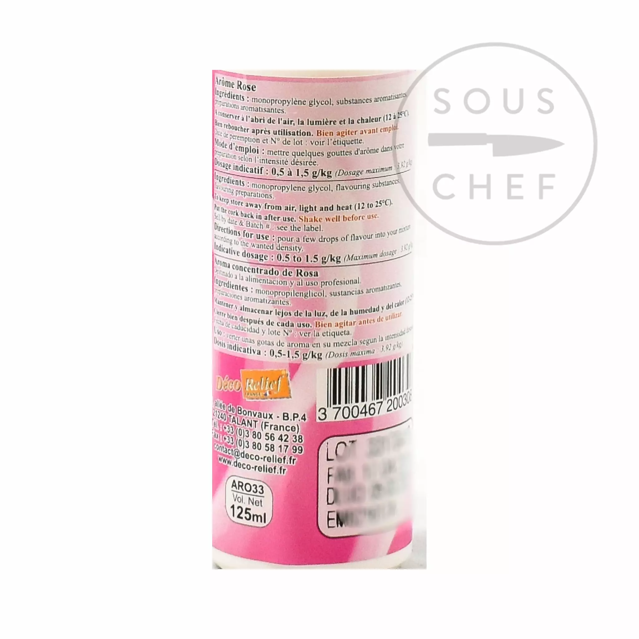 This concentrated rose flavour brings an intense rose flavour and aroma to baking and patisserie. The rose flavouring brings distinctive notes of Middle Eastern pastries, or classic English summer gardens.