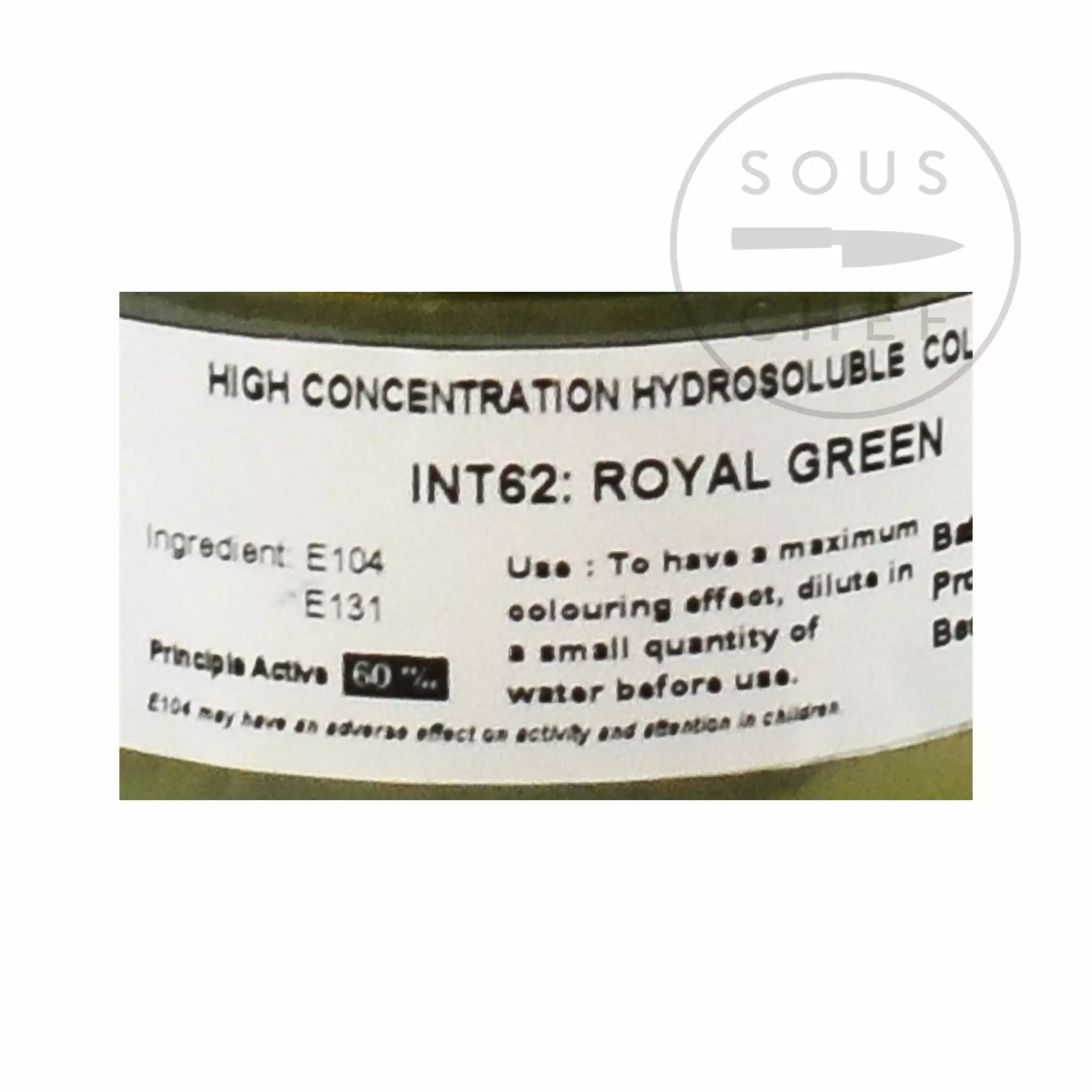 The royal green food colour is water soluble. For maximum effect, dilute in a small amount of water before use. Recommended use is 1tsp of colouring in 1tsp water to colour 2kg of sugar. Contains 50g, or approx 60ml, or 12 tsp – enough for 24kg sugar.