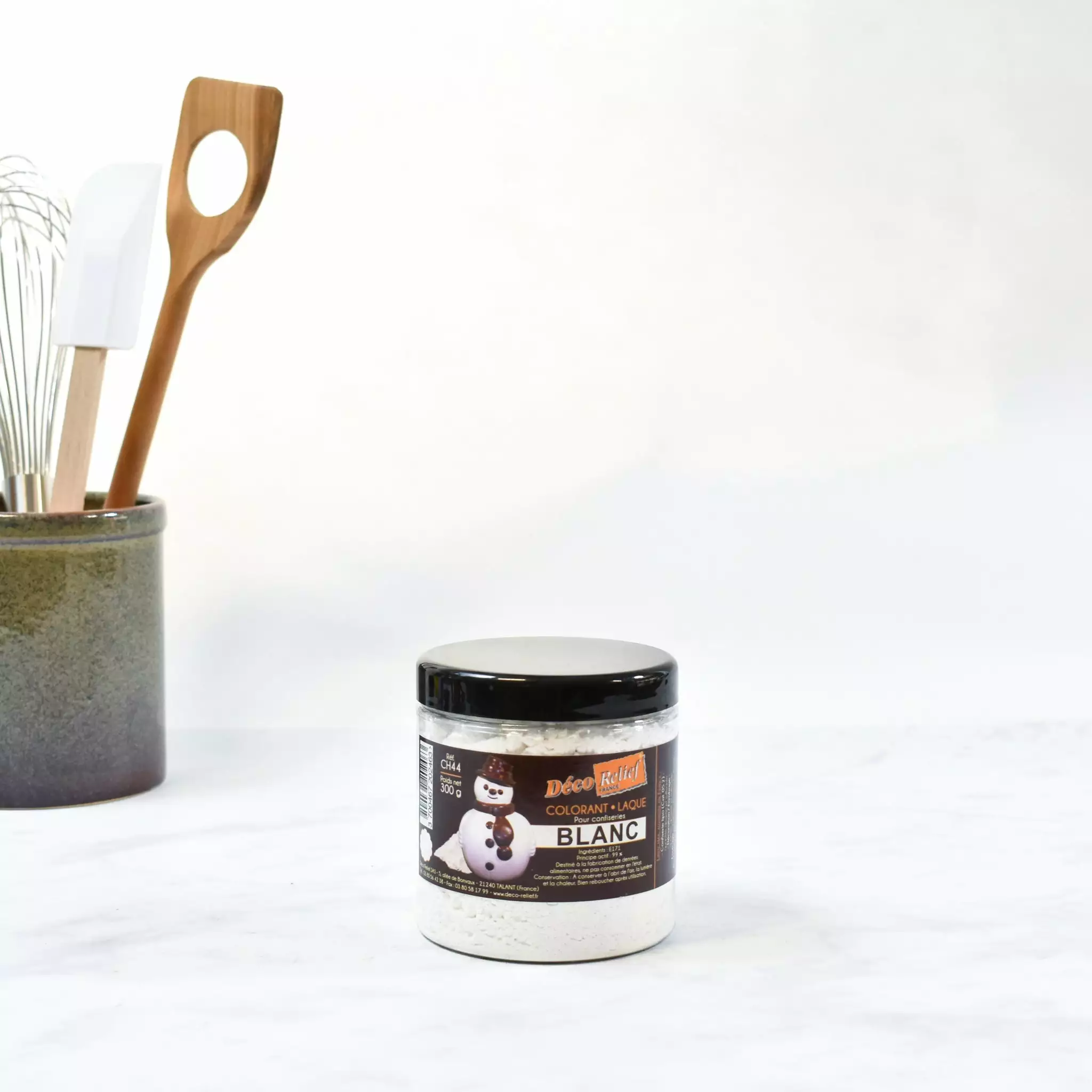 This professional white food colouring is fat soluble, perfect for use in pastry and chocolate work. The white food colour is made with a titanium dioxide base – and can also be stirred into the mix to whiten macarons, or other pastry desserts.