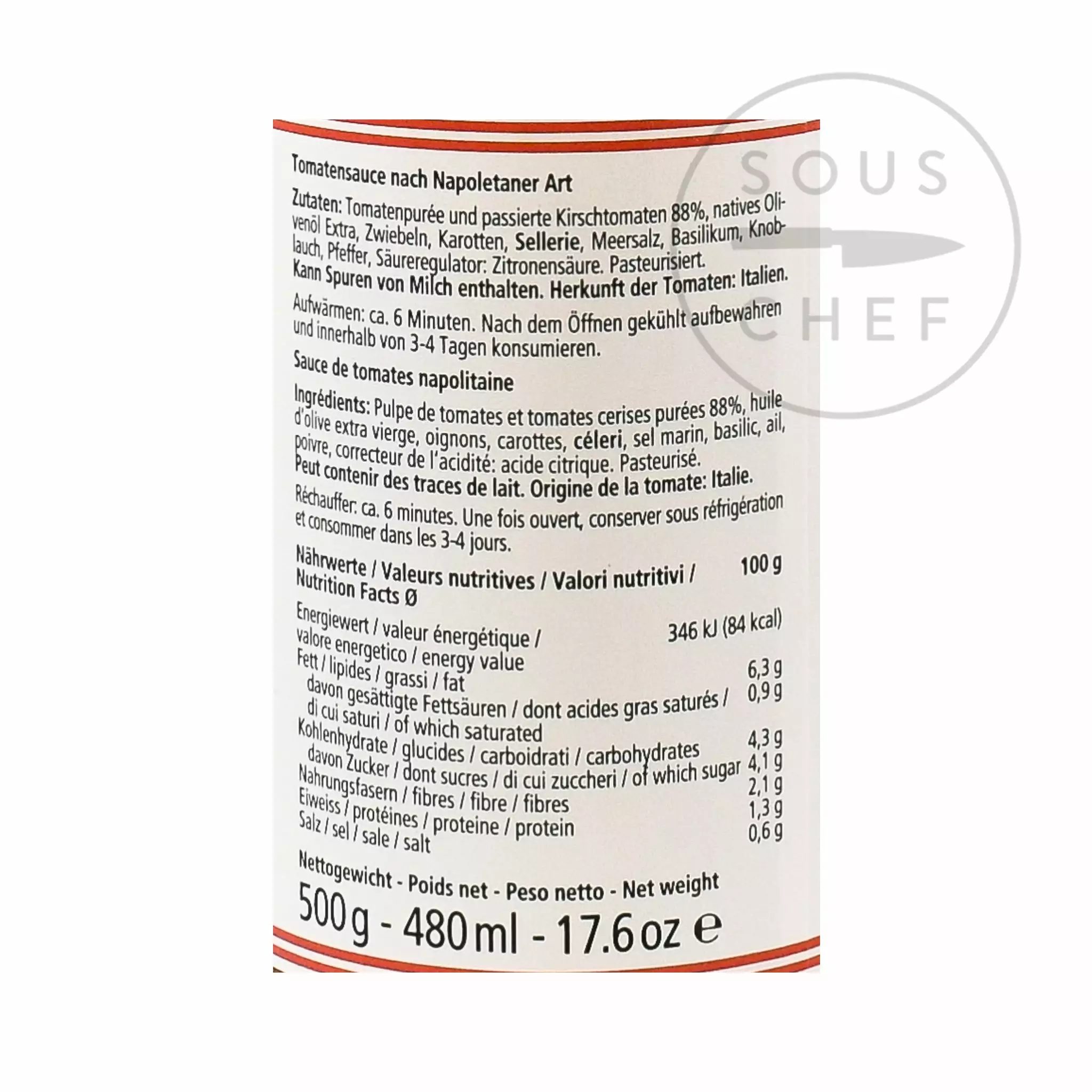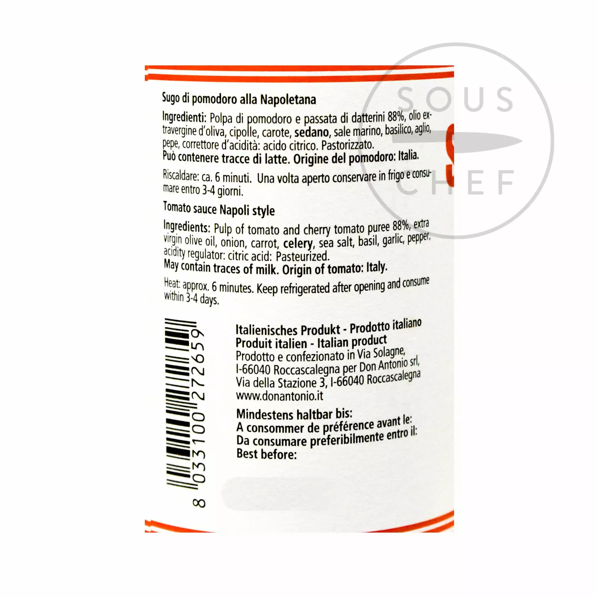 Ingredients: pulp of tomato and cherry tomato puree (88%), extra virgin olive oil, onion, carrot, celery, sea salt, basil, garlic, pepper, acidity regulator: citric acid. Allergens are listed in bold. May also contain traces of milk.
