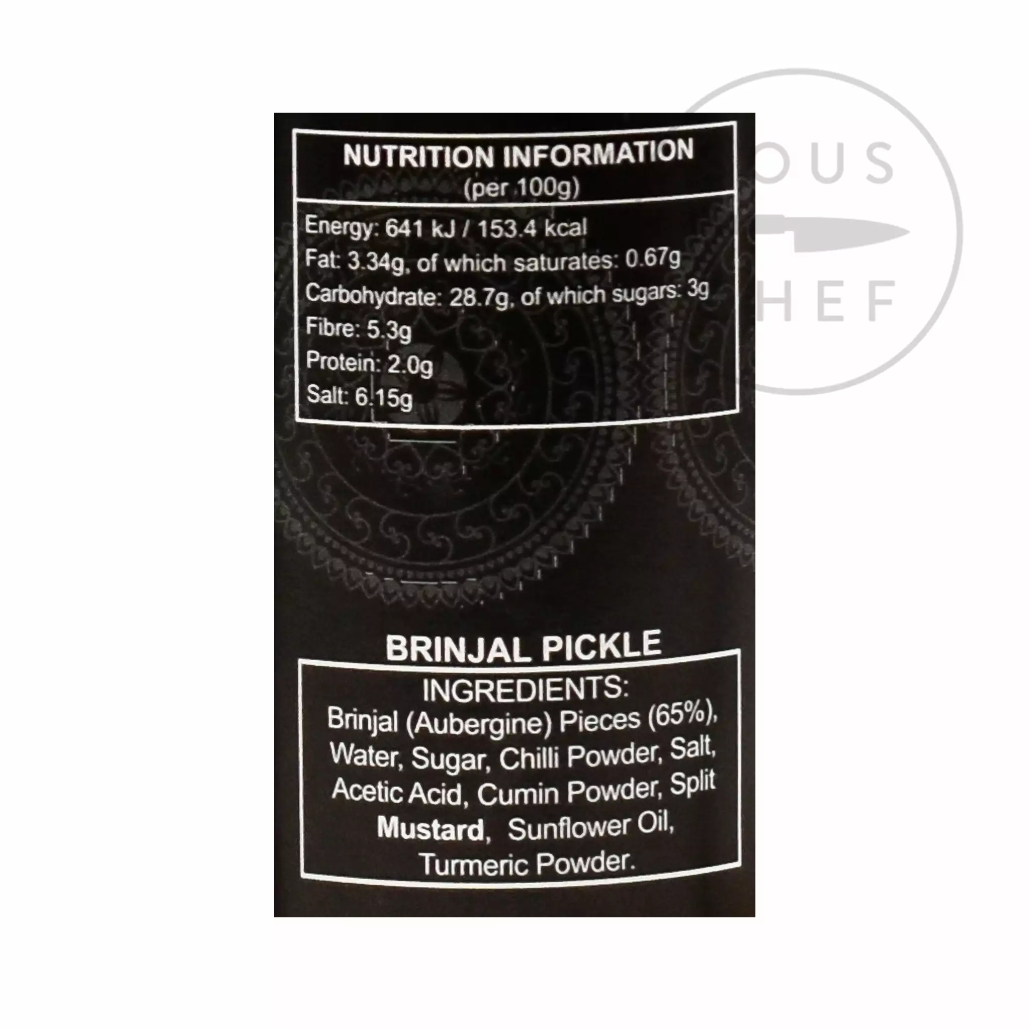 Ingredients: Brinjal (aubergine) pieces 65%, sugar, water, sunflower oil, chilli, salt, acetic acid, mustard, cumin powder, turmeric powder. Contains mustard.