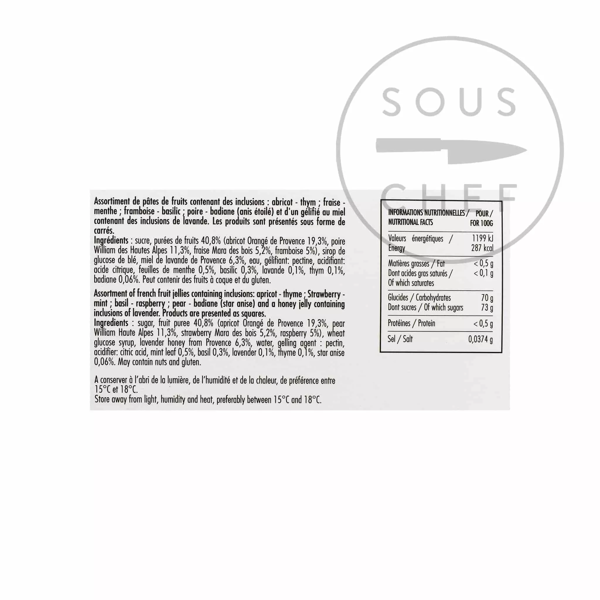 Ingredients: Sugar, fruit puree 40.8% (apricot from Provence 19.3%, pear William from Haute Alpes 11.3%, strawberry 5.2%, raspberry 5%), wheat glucose syrup, lavender honey from Provence 6.3%, water, gelling agent: pectin, acidifier: citric acid, mint leaf 0.5%, basil 0.3%, lavender 0.1%, thyme 0.1%, star anise 0.06%.