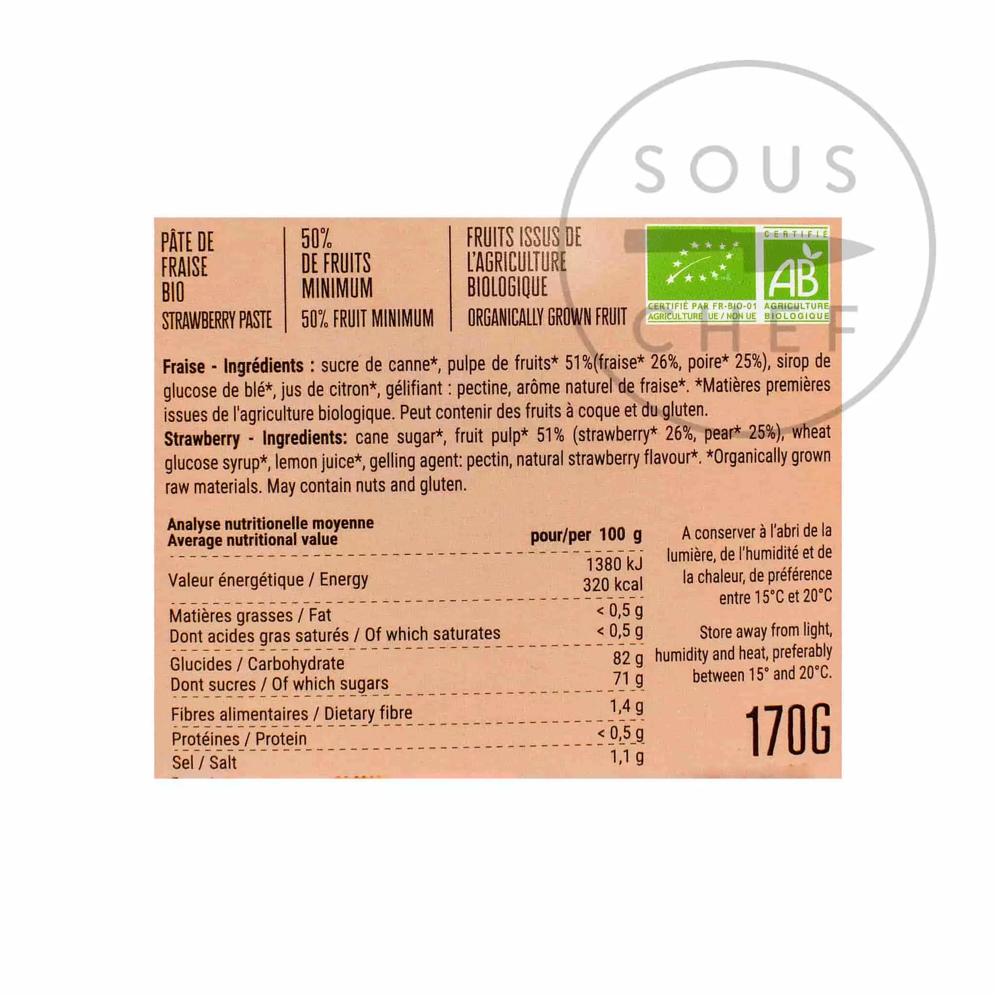 Ingredients: Cane sugar, fruit pulp 51% (strawberry 26%, pear 25%), wheat glucose syrup, lemon juice, gelling agent: pectin, natural strawberry flavour.