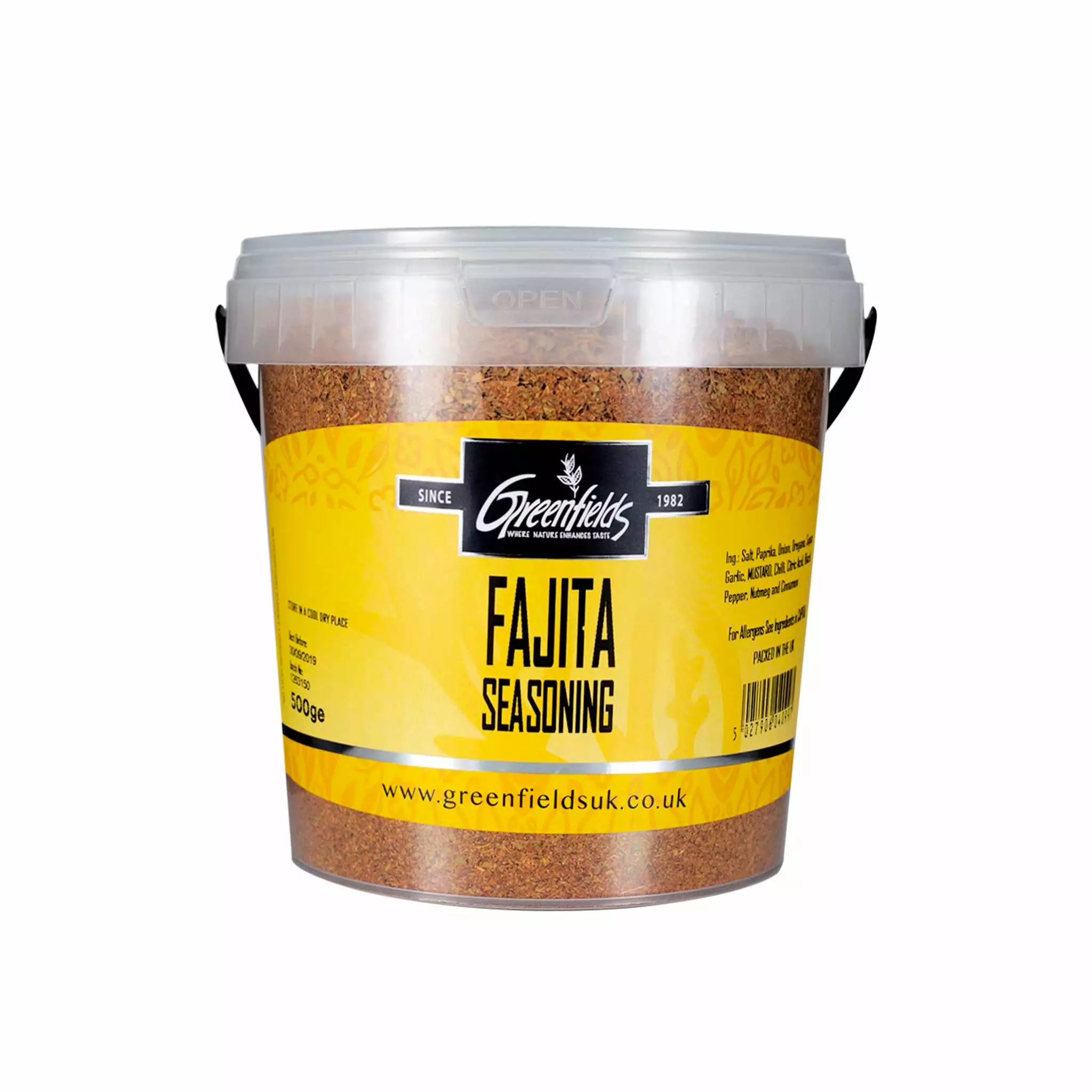 Fajita seasoning from Greenfields, a second generation UK-based family business. Greenfields’ herbs and spices are used by restaurants, artisans and street food producers across the country – all who enjoy their great value, kitchen-safe and easy-to-use resealable plastic tubs for their ingredients. Their philosophy is to provide good quality products at a great price.