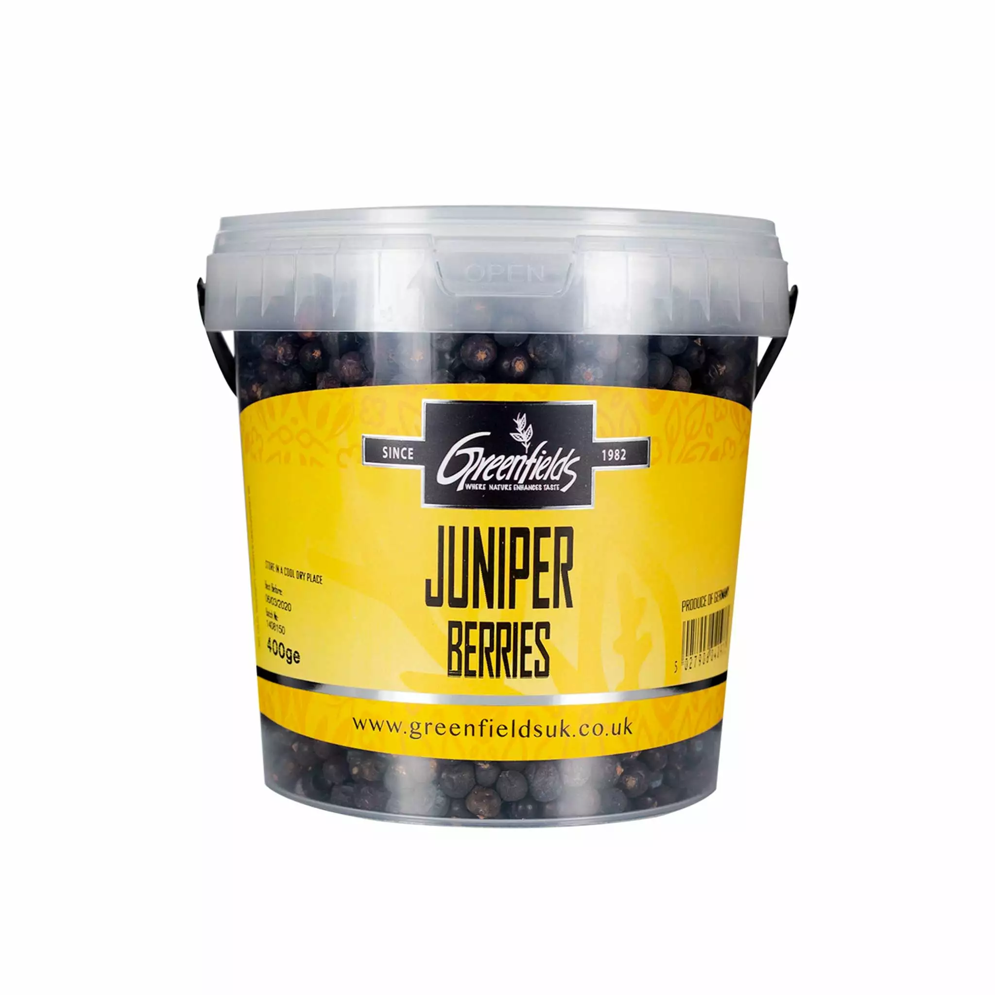 Juniper berries from Greenfields, a second generation UK-based family business. Greenfields’ herbs and spices are used by restaurants, artisans and street food producers across the country – all who enjoy their great value, kitchen-safe and easy-to-use resealable plastic tubs for their ingredients. Their philosophy is to provide good quality products at a great price.