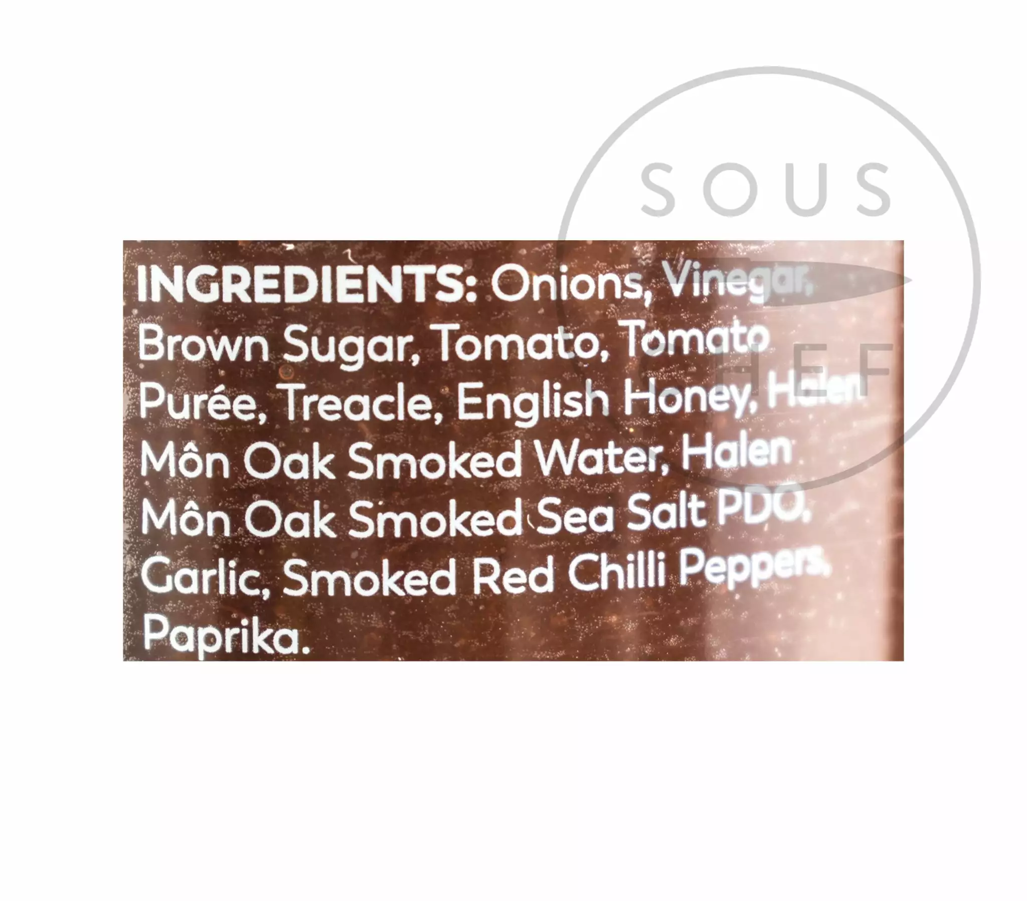 Ingredients: Onions, vinegar, brown sugar, tomato, tomato puree, treacle, English honey, Halen Môn smoked water, Halen Môn smoked sea salt PDO, garlic, smoked red chilli peppers, paprika.