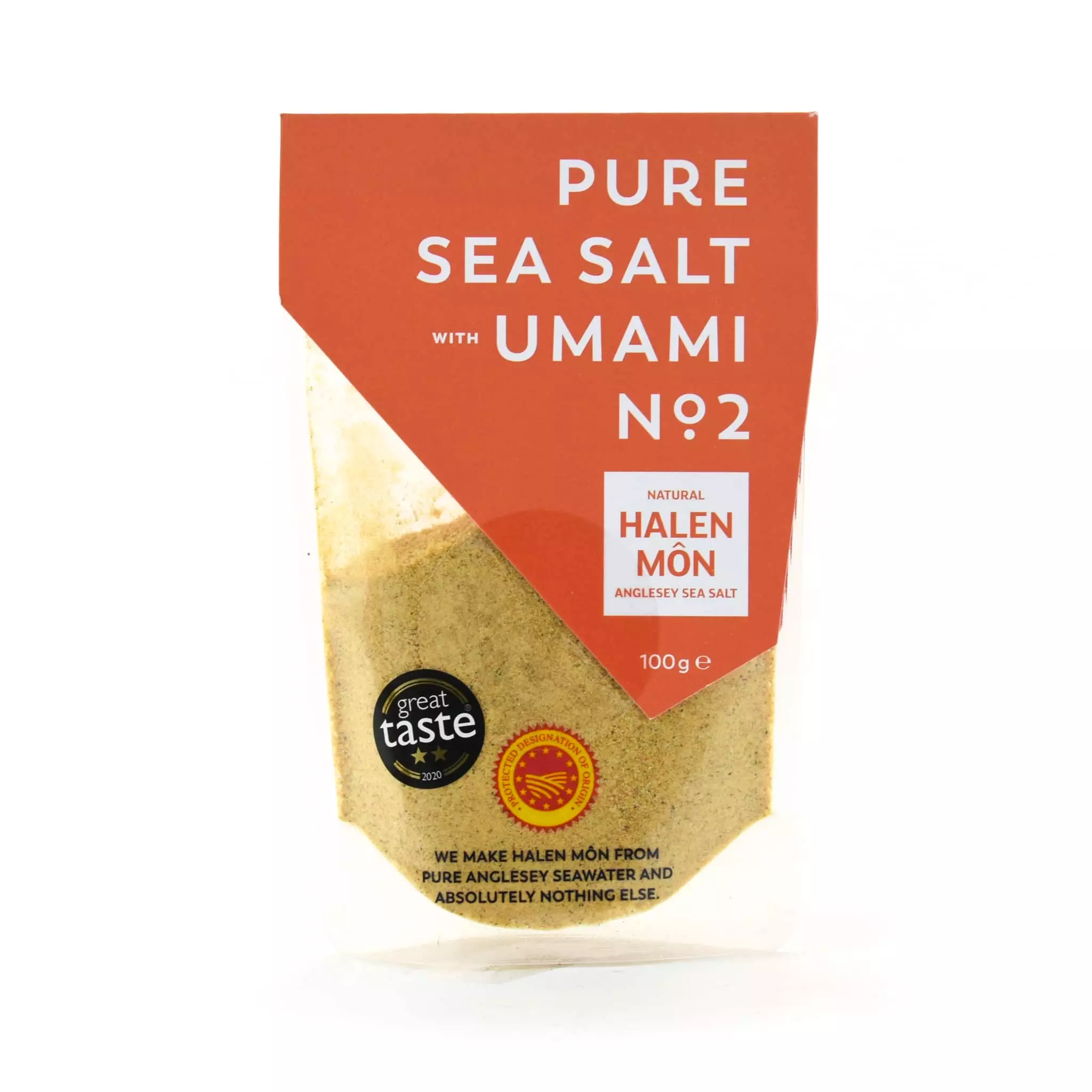 Ingredients: Ground Halen Môn pure sea salt PDO (45%), umami mix (nutritional yeast, sugar, garlic powder, chilli powder, cumin) (55%)