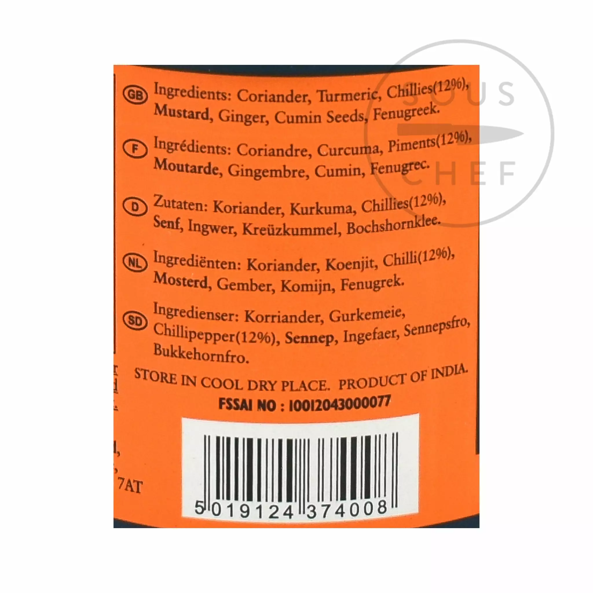 Ingredients: Coriander, turmeric, mustard, chilli (12%), ginger, cumin, fenugreek. Allergens listed in bold.