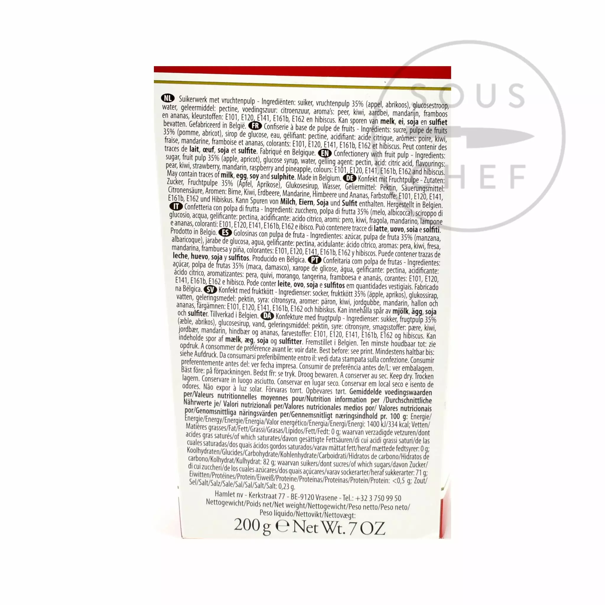 Ingredients: Sugar, fruit pulp 35% (apple, apricot), glucose syrup, water, gelling agent: pectin, acid: citric acid, flavourings: pear, kiwi, strawberry, mandarin, raspberry and pineapple, colours: e101, e120, e141, e161b, e162 and hibiscus. May contain milk, egg, soy, sulfiet. Allergens listed in bold.