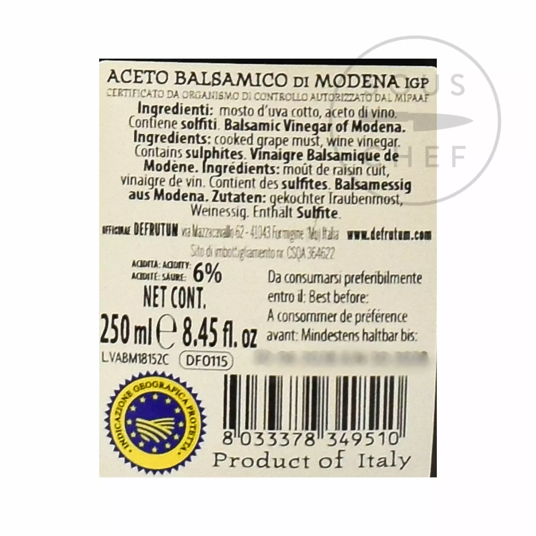 Defrutum 8-year aged balsamic vinegar has been awarded IGP, or Indicazione Geografica Protetta, status. This shows that it is one of the protected classifications of balsamic vinegar, Balsamic Vinegar of Modena. The production process is rigorously monitored – and unlike ‘balsamic condiment’ or cheaper ‘balsamic vinegars’ – which usually have no ageing, true Balsamic Vinegar of Modena must be aged for a minimum of 60 days in wood.