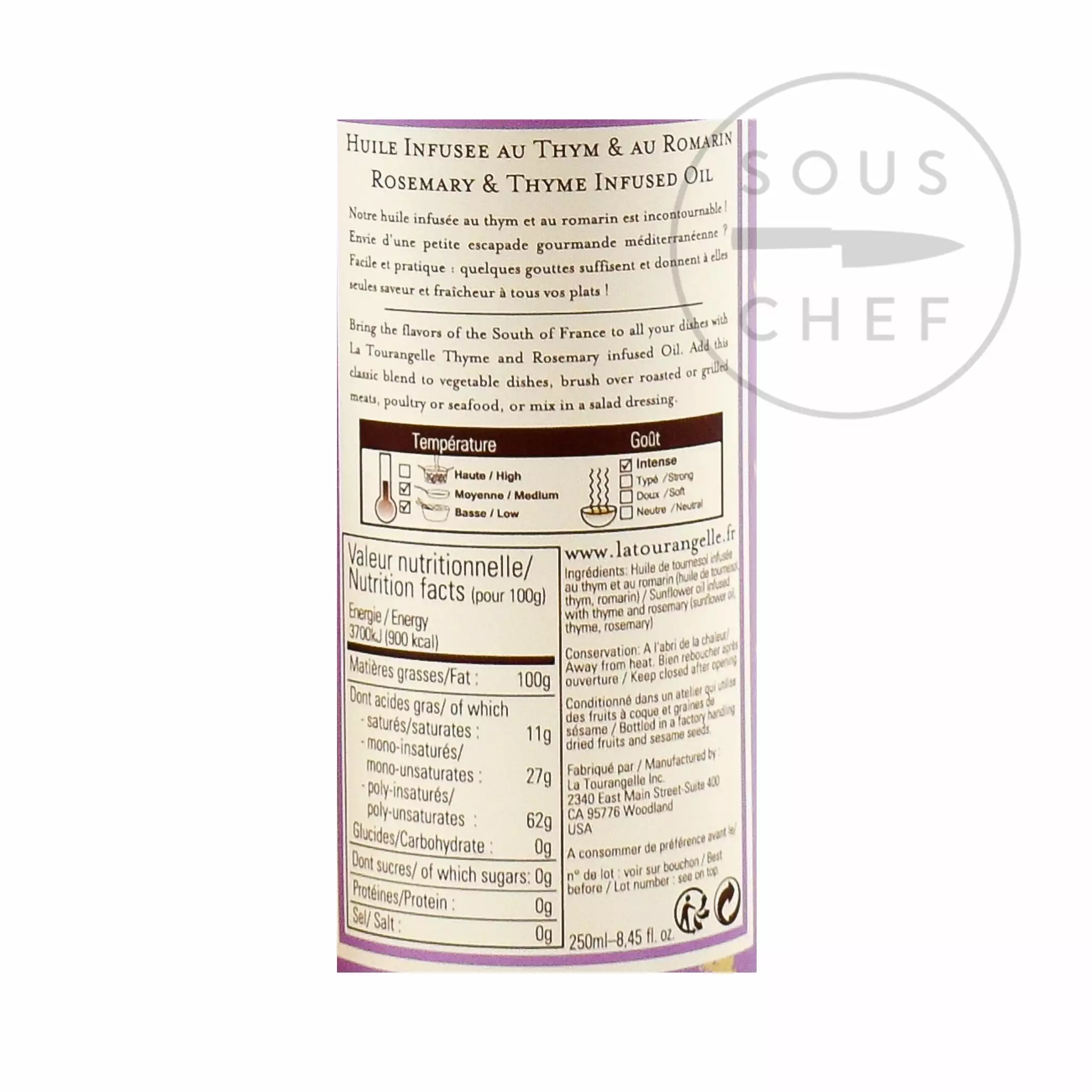 La Tourangelle select the freshest rosemary and thyme to infuse in their sunflower oil for an intense flavour. As well as being a great finishing oil for vegetables, chicken and salads, the infused oil is also suitable for cooking at low and medium temperatures. Try adding to a casserole or stew during cooking, or even add to the pan towards the end of frying potatoes.