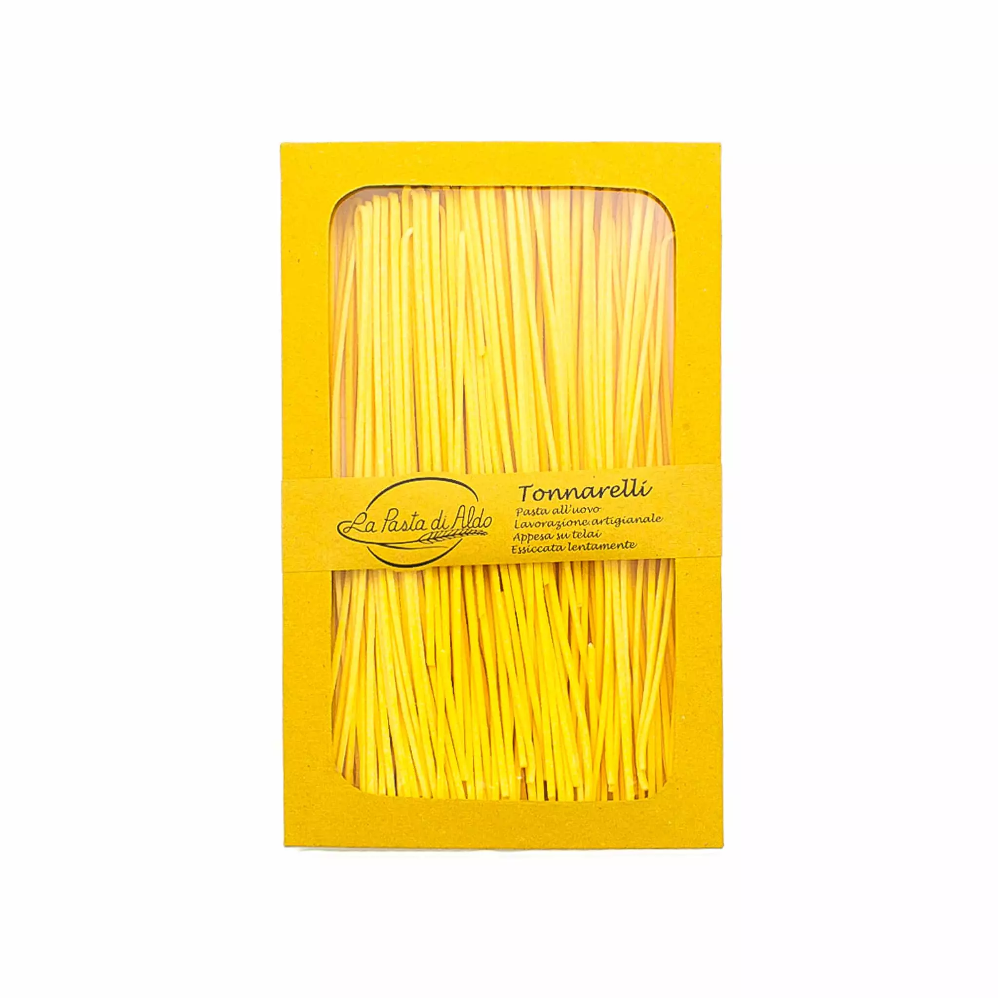 Pasta di Aldo tonnarelli egg pasta is a long and thin pasta specifically shaped for the roman dish of Cacio e Pepe. It is slightly thicker than spaghetti with a rougher finish, which helps the parmesan sauce bind to the ribbons for the creamiest pasta dish.