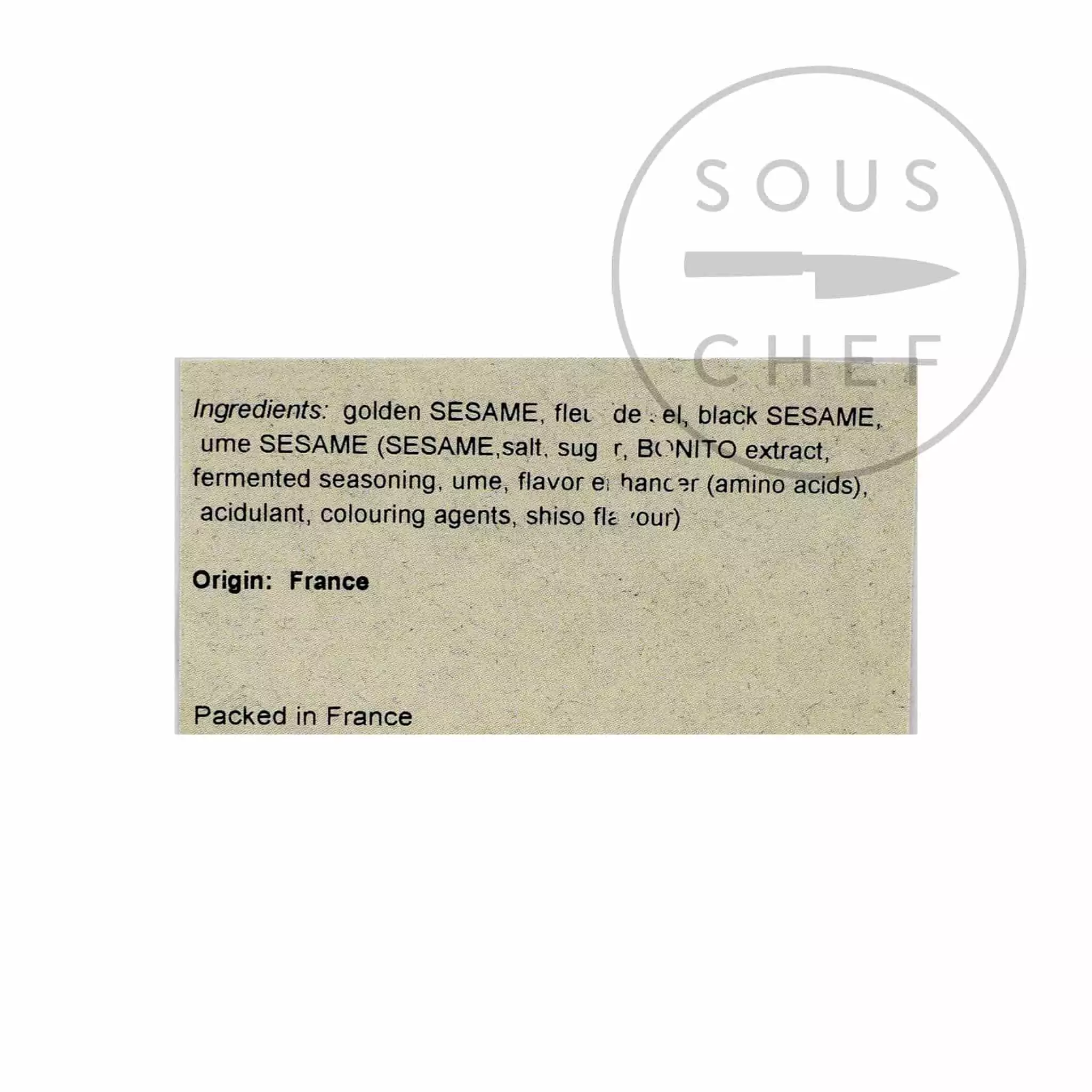 Ingredients: Golden sesame, fleur de sel, black sesame, ume sesame (sesame, salt, sugar, bonito extract, fermented seasoning, ume, flavour enhancer (amino acids), acidulant, colouring agents, shiso flavour).