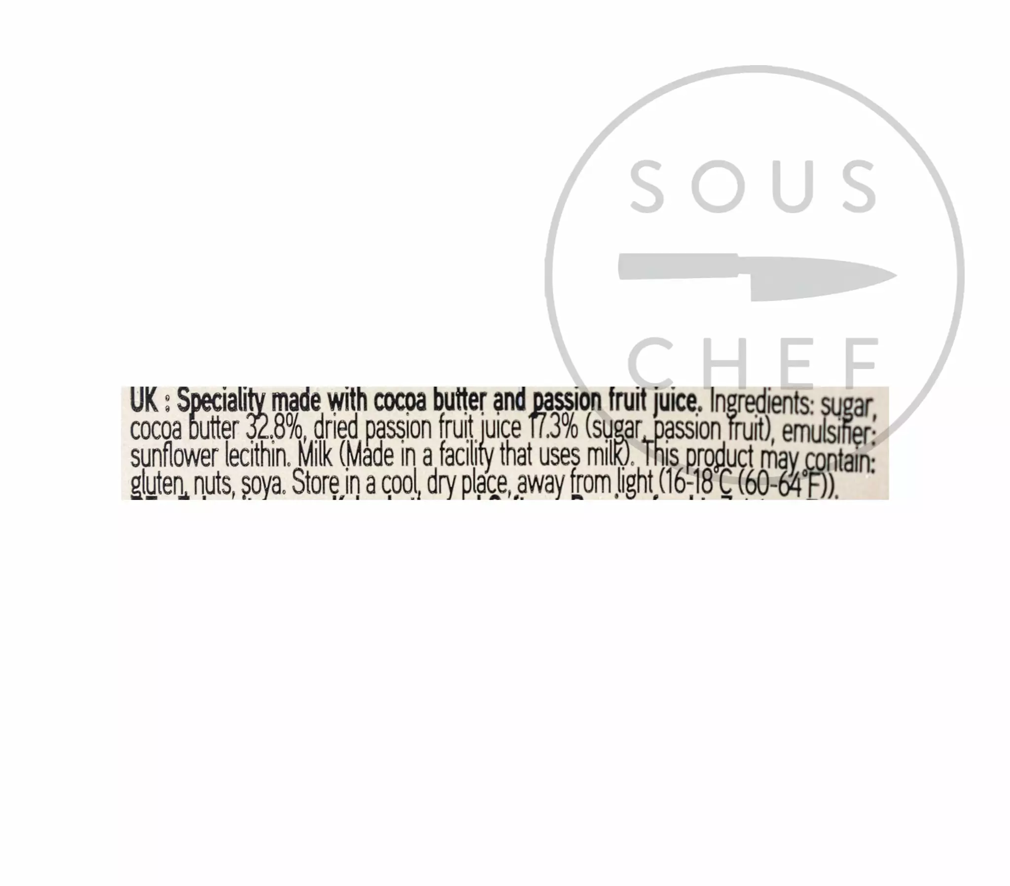 Ingredients: Sugar, cocoa butter 32.8%, dried passion fruit juice 17.3% (sugar, passion fruit), emulsifier: sunflower lecithin.
