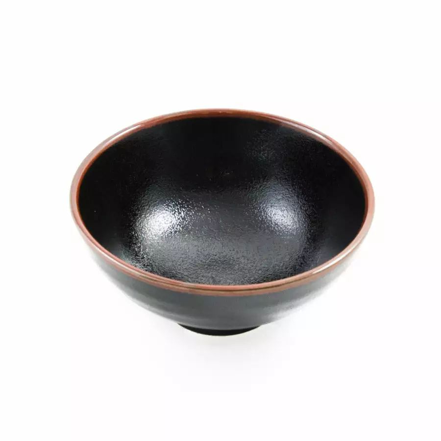 This black stoneware ramen bowl with a dimpled texture and brown rim makes for an attractive piece of tableware. The black glaze creates a dramatic background, working particularly well against both light food, such as rice dishes or chowders, and brightly-coloured soups or fresh salads.