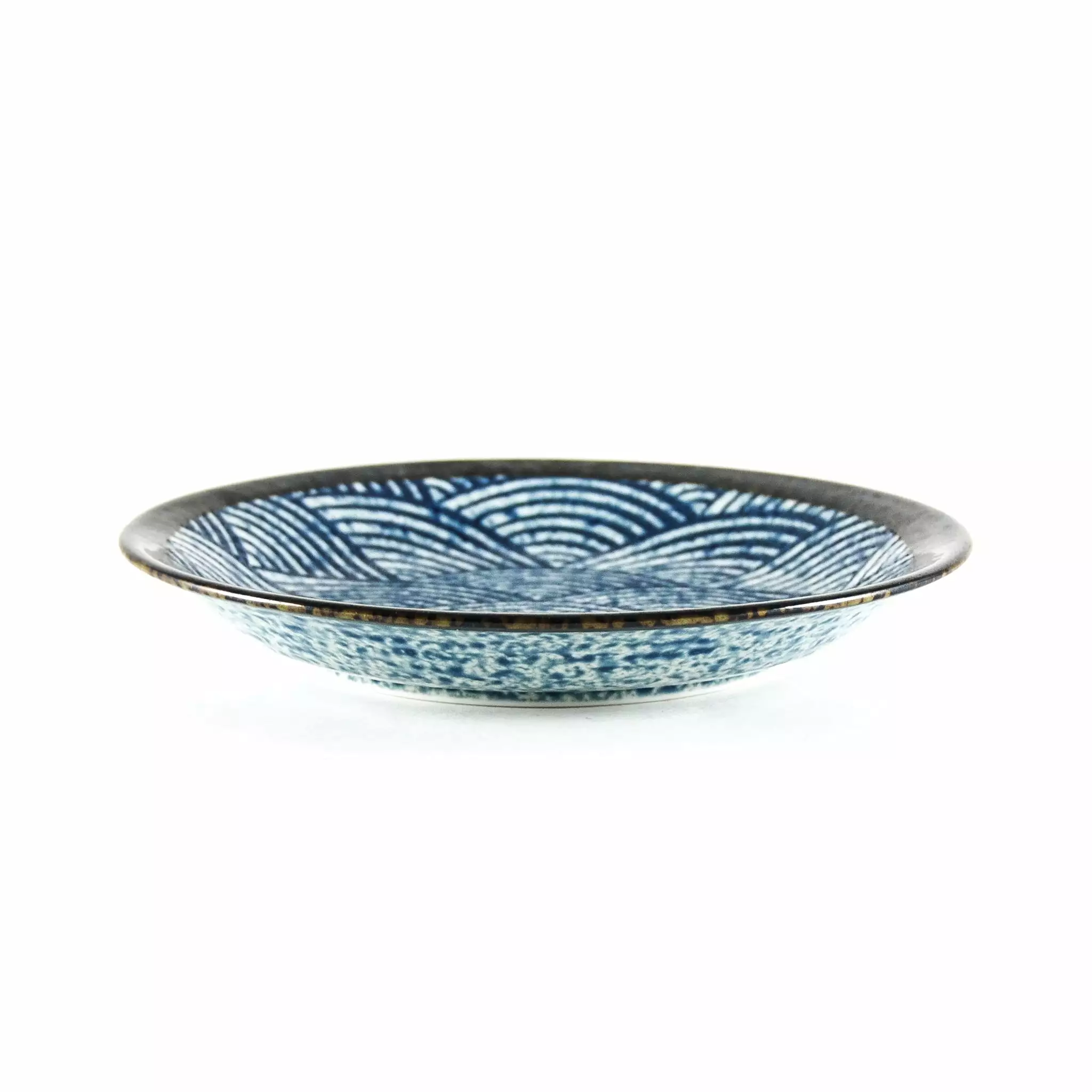 The plate is decorated with a textured white and blue glaze in a stylised wave pattern, and is finished with a glossy brown-black border.