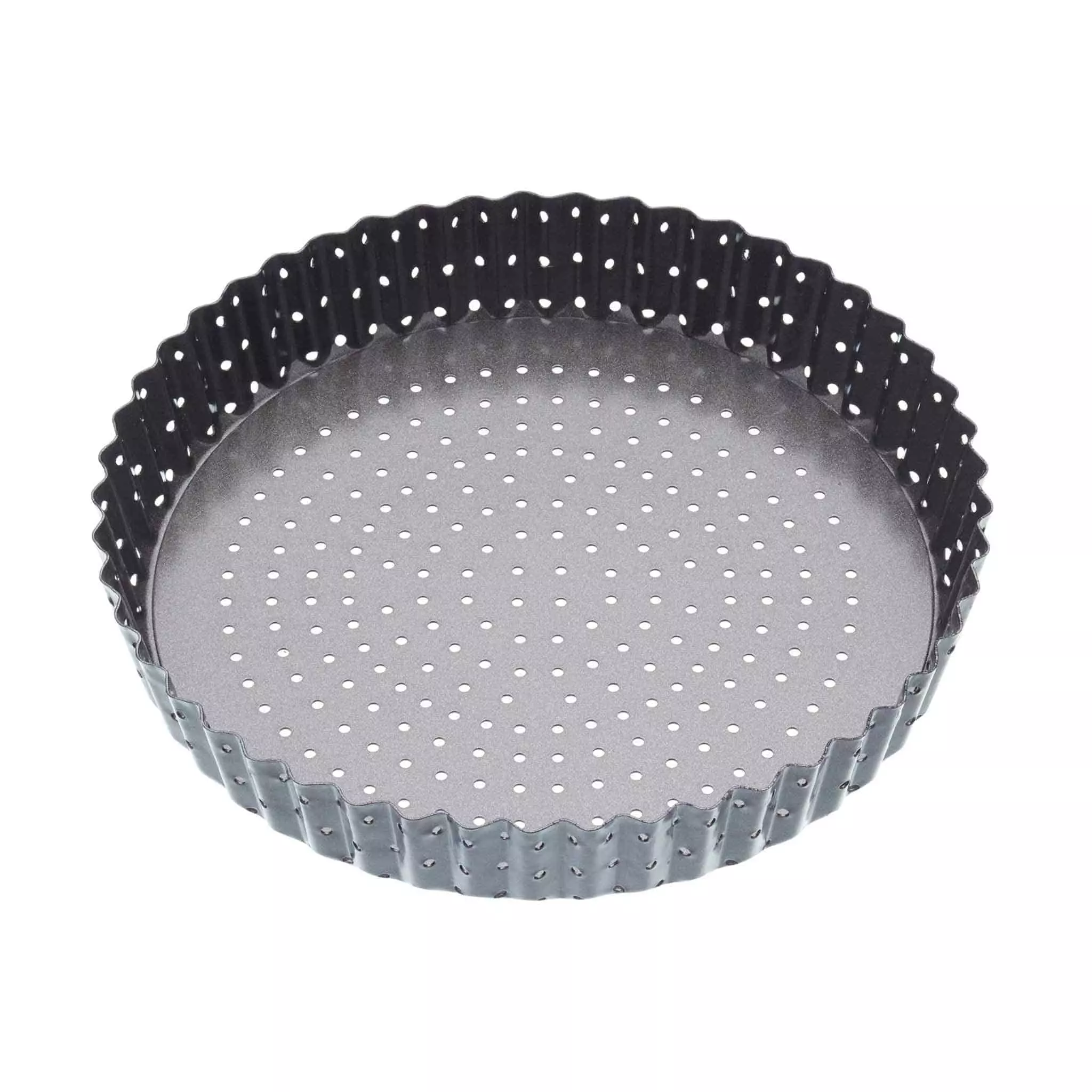 KitchenCraft’s Crusty Bake non-stick quiche tin has fluted edges and 3cm deep sides. The perforated base and edges are the key to beautifully baked golden pastry. While baking, any excess moisture can escape through the small holes – not a soggy bottom in sight!