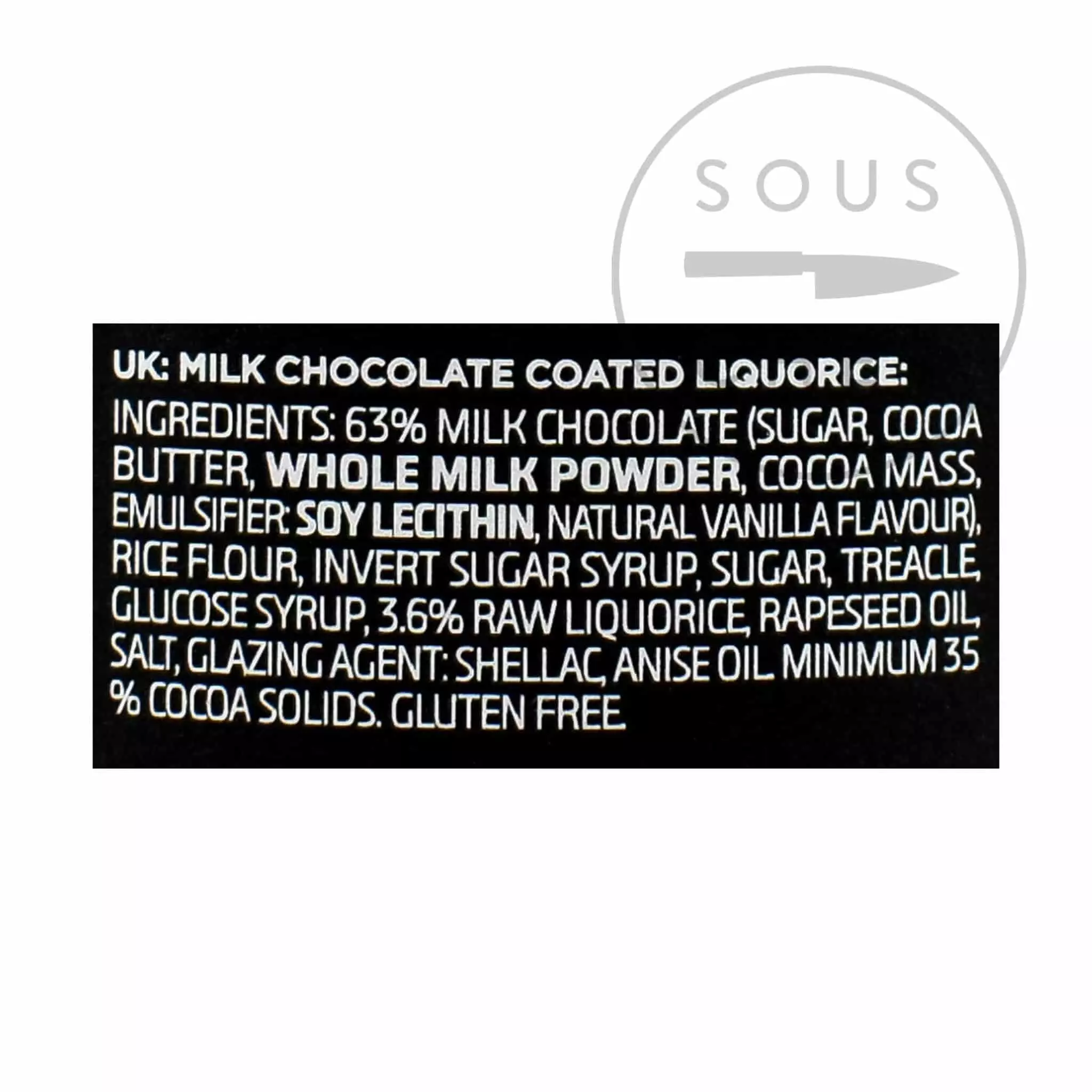 Ingredients: 63% milk chocolate (sugar, cocoa butter, whole milk powder, cocoa mass, emulsifier: soy lecithin, natural vanilla flavouring), rice flour, invert sugar syrup, sugar, treacle, glucose syrup, 3.6% raw liquorice, rapeseed oil, salt, glazing agent: shellac, anise oil. Minimum 35% cocoa solids. Gluten free.