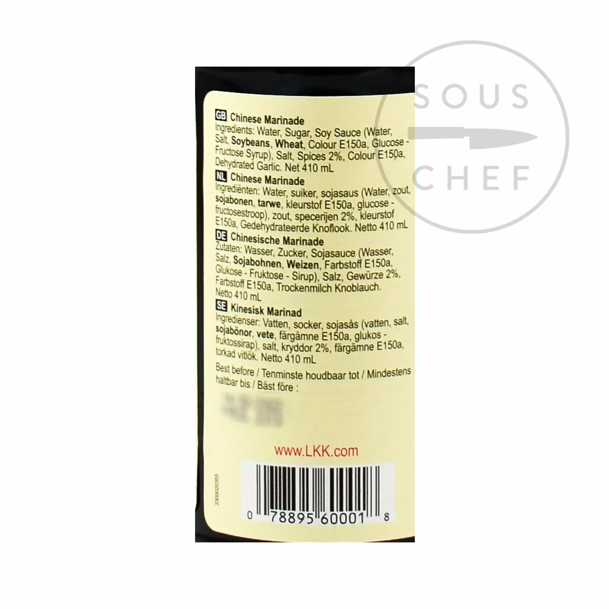 Ingredients: Water, Sugar, Soy Sauce (Water, Salt, Soybeans, Wheat, Colour E150a, Glucose – Fructose Syrup), Salt, Spices 2%, Colour E150a, Dehydrated Garlic. Allergens are listed in bold.
