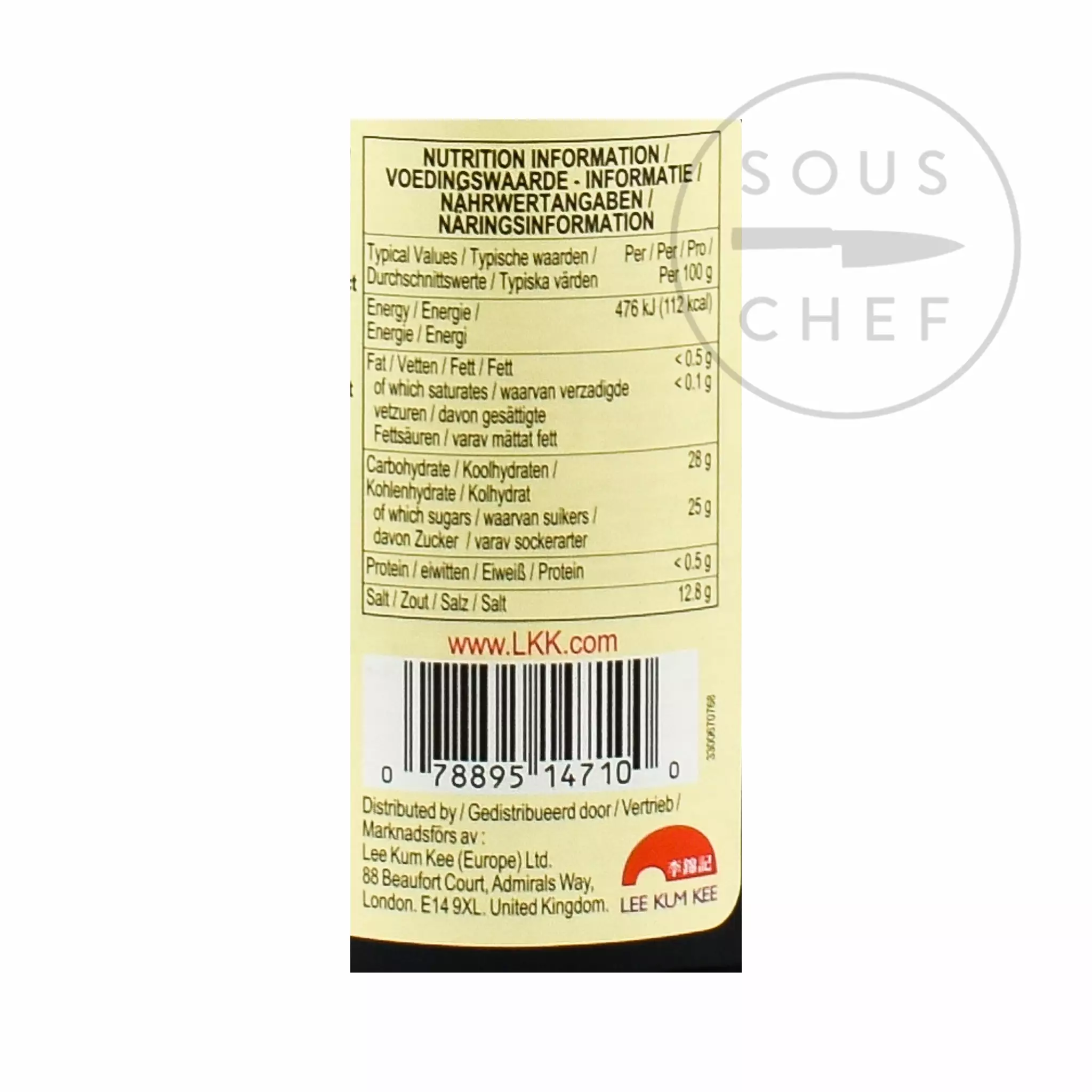 Ingredients: Water, sugar, salt, oyster extract 5%, modified corn starch, colour e150a. Allergens listed in bold.