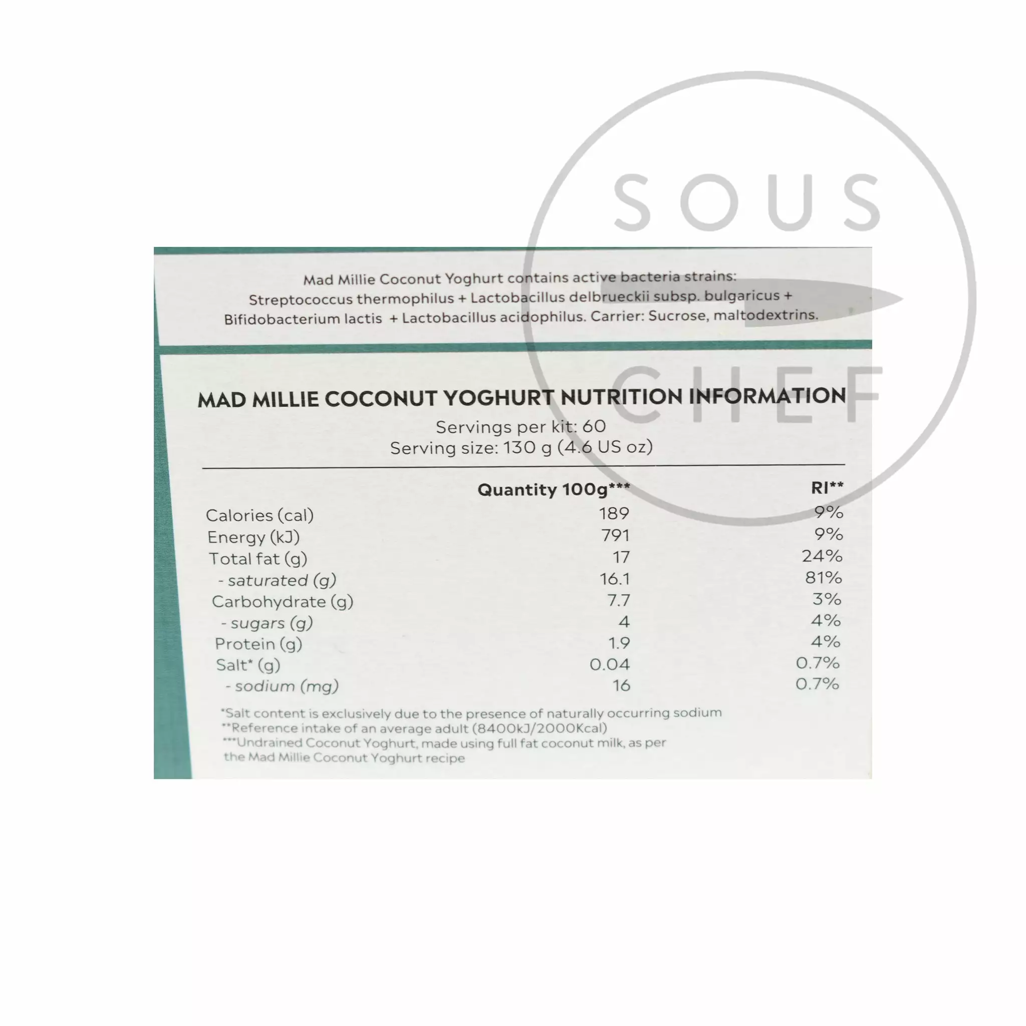 The coconut yoghurt kit comes with active bacteria cultures to turn the coconut milk into yoghurt. There’s no artificial colours or preservatives and the live cultures support gut health, too! The kit contains enough cultures and thickener to make up to 8 litres of coconut yoghurt in total.