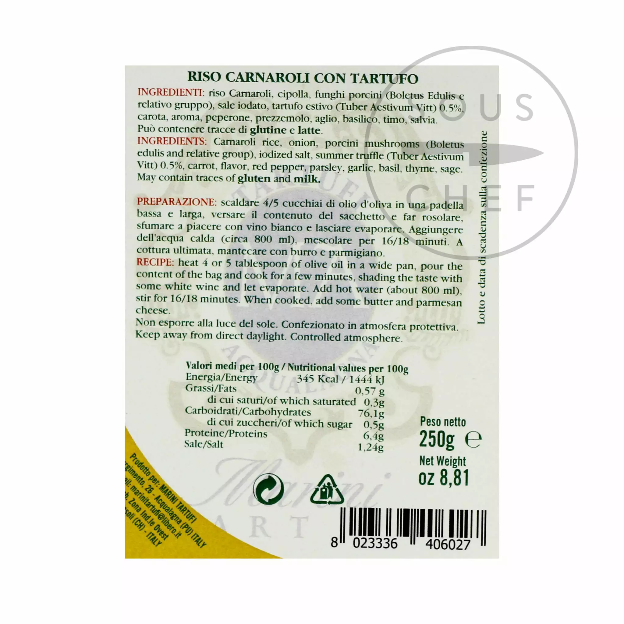 Ingredients: Carnaroli rice, onion, porcini mushrooms (boletus edulis and relative group), iodized salt, summer truffles (tuber aestivum vitt) 0.5%, carrot, flavor, red pepper, parsley, garlic, basil, thyme, sage. May contain traces of gluten and milk.