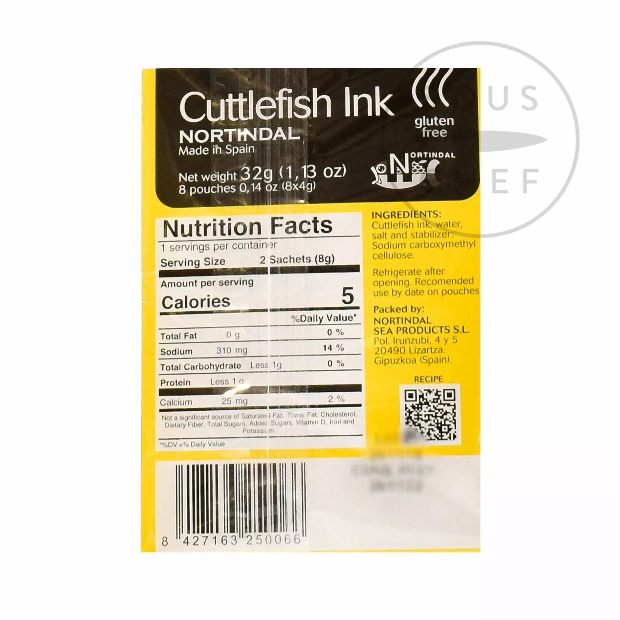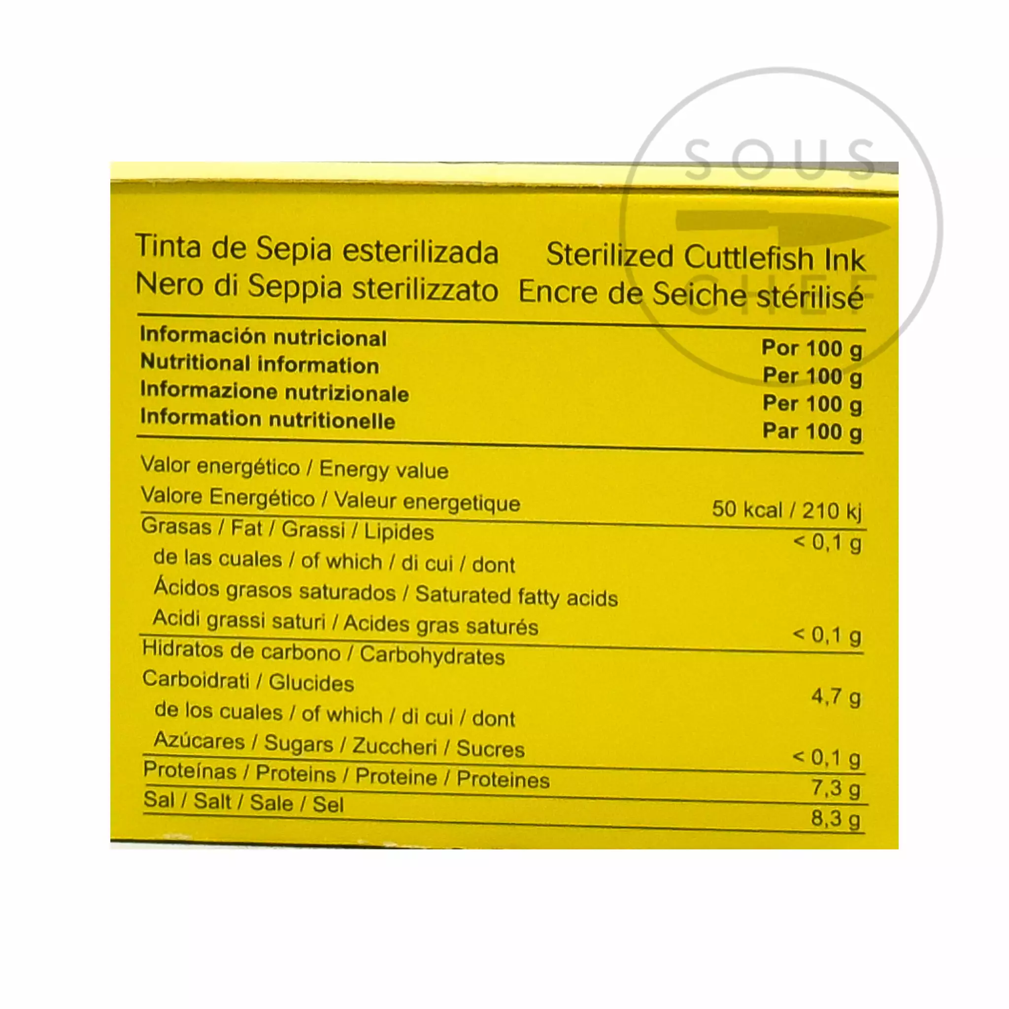 Ingredients: Cuttlefish ink, water, salt and thickener (E466). Contains molluscs, and may contain traces of crustaceans, fish, celery, milk and sulphur dioxides.