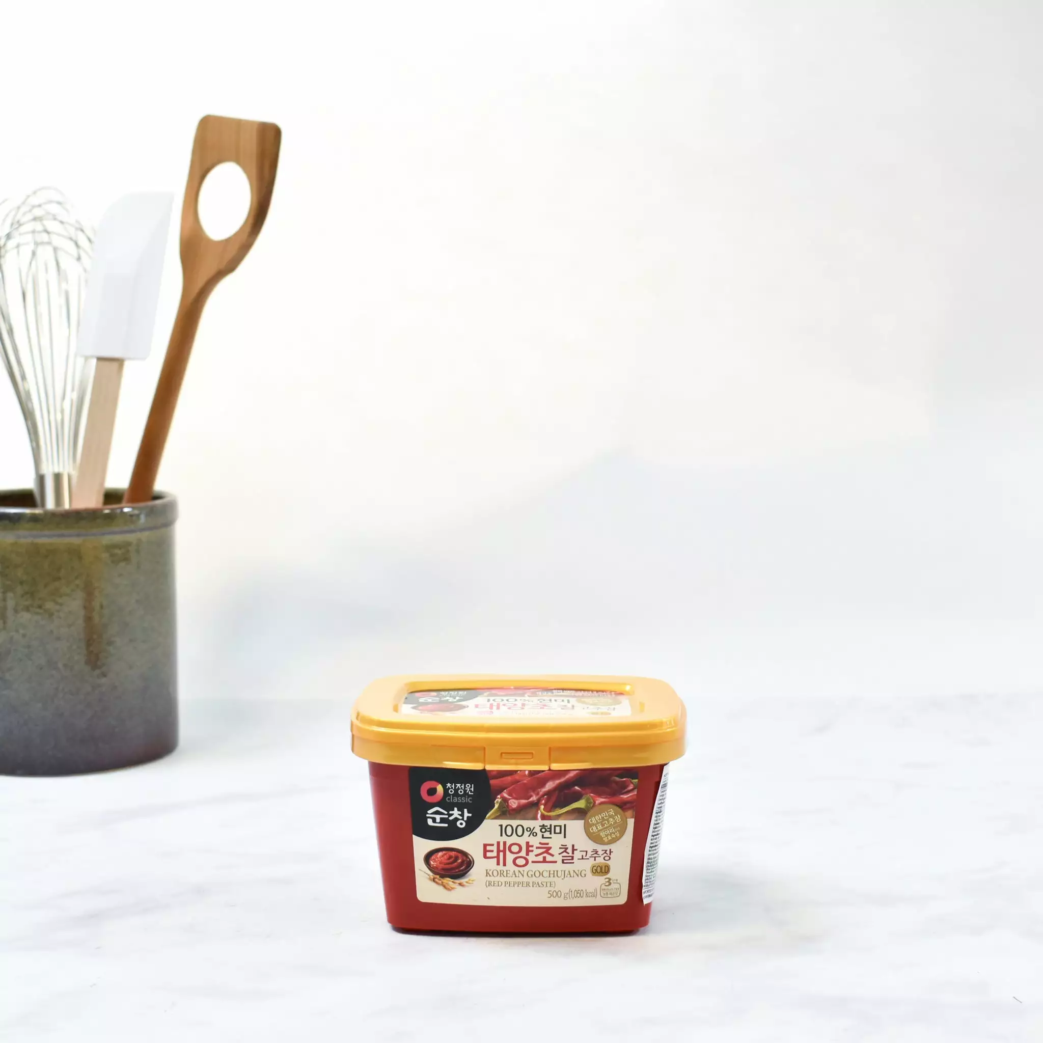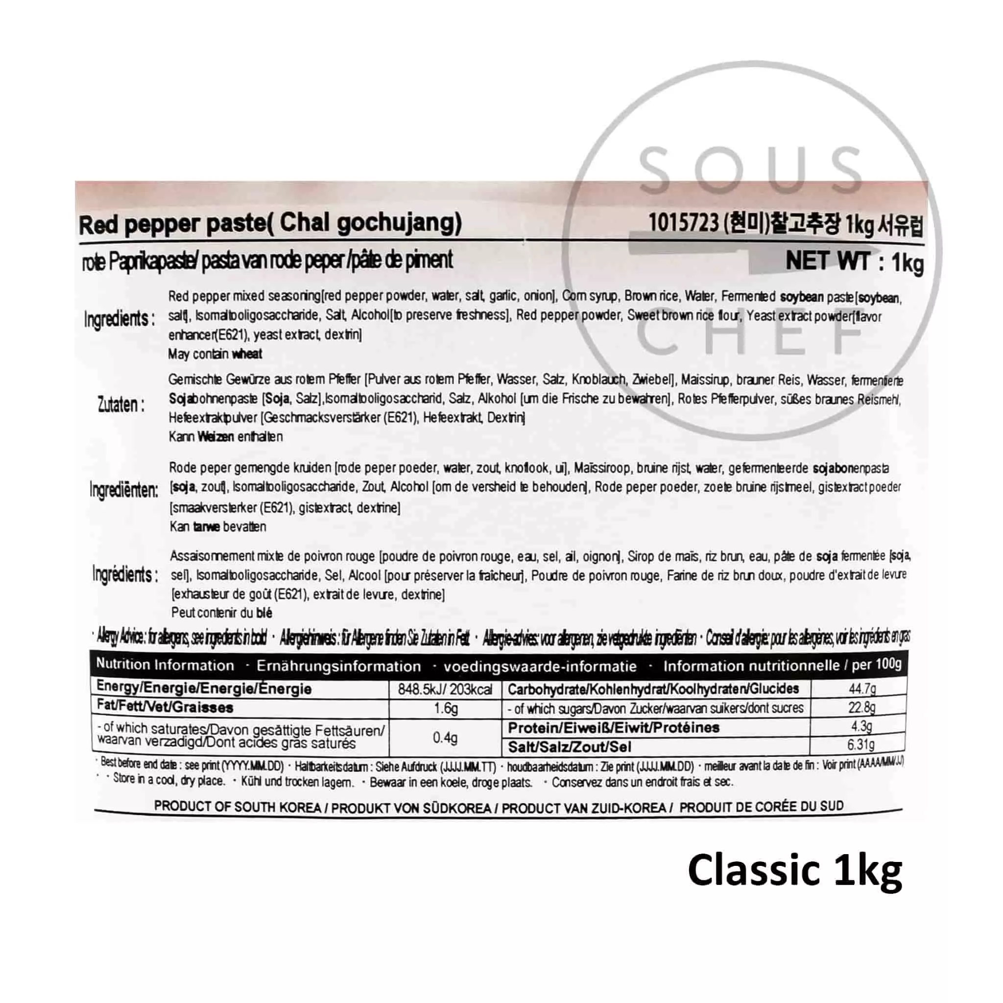 Gochujang Classic: 1kg: corn syrup, red pepper mixed seasoning (red pepper powder, sea salt, garlic, onion), brown rice, water, isomaltooligosaccharide, fermented soybean paste (soybean, salt) salt, alcohol (to preserve freshness), red pepper powder, sweet brown rice flour, yeast extract powder (flavour enhancer E621, yeast extract, dextrin). May contain wheat.