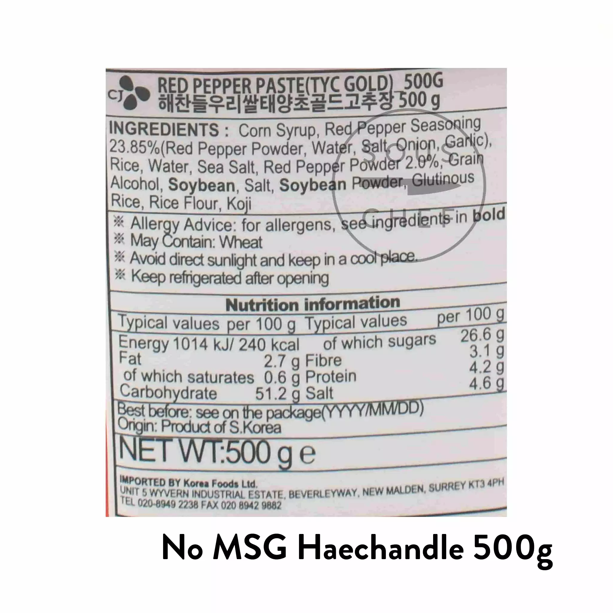 Gochujang Haechandle No MSG – 500g: corn syrup, red pepper seasoning 23.85% (red pepper powder, water, salt, onion, garlic), rice, water, sea salt, red pepper powder 2%, grain alcohol, soybean, salt, soybean powder, glutinous rice, rice flour, Koji. May contain wheat.