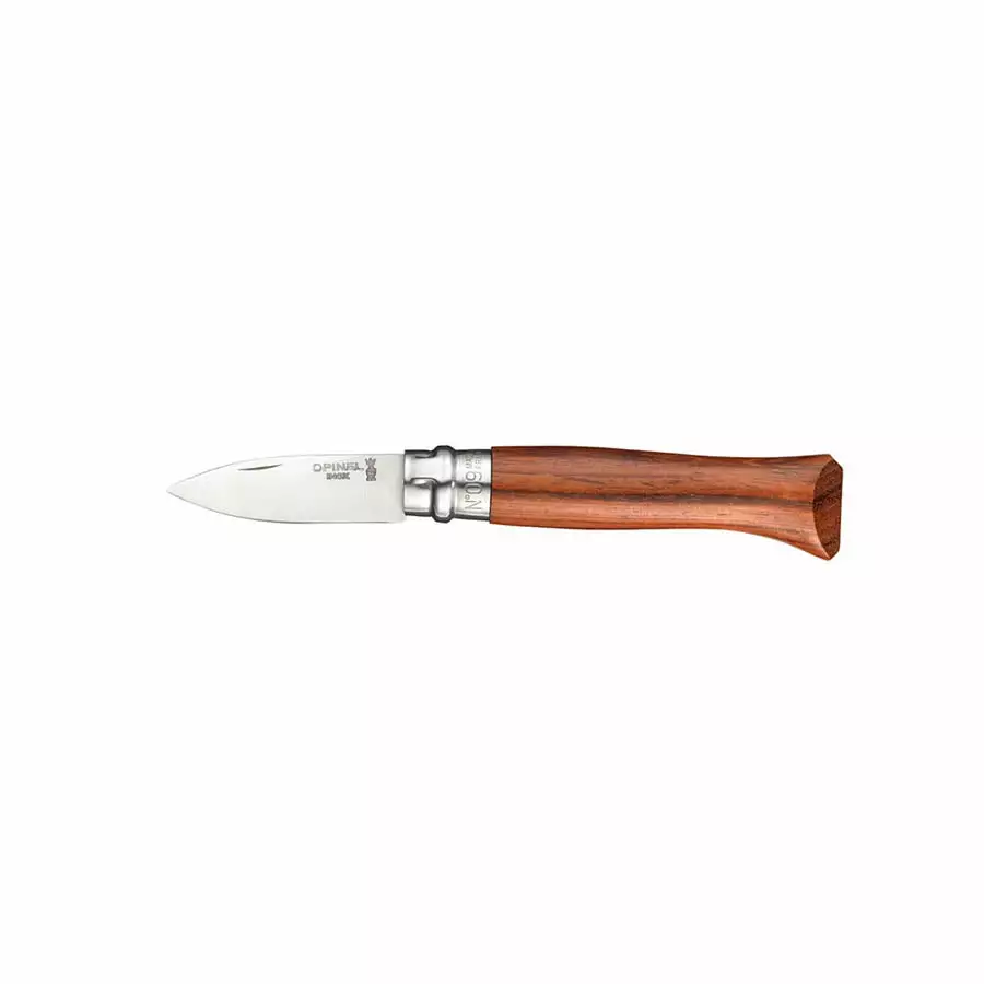 The Opinel oyster & shellfish folding knife is a robust, short-bladed knife for opening oysters and other shellfish. The narrow point of the blade easily gets in between the two shell halves, and the African bubinga wood handle provides good grip for the twisting motions needed to prise open the shell.