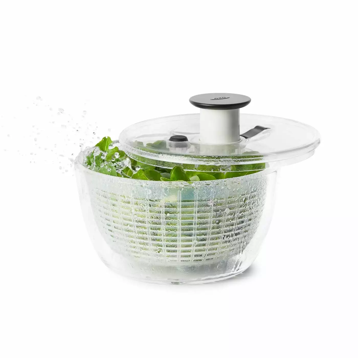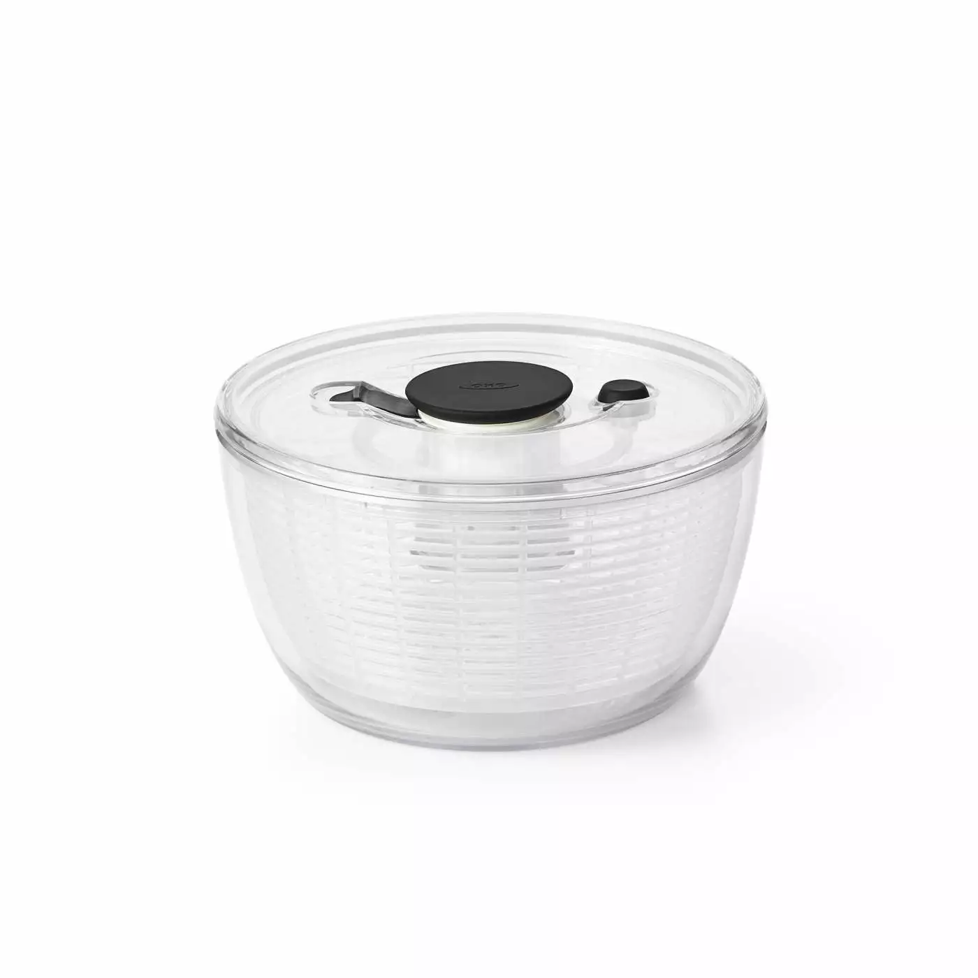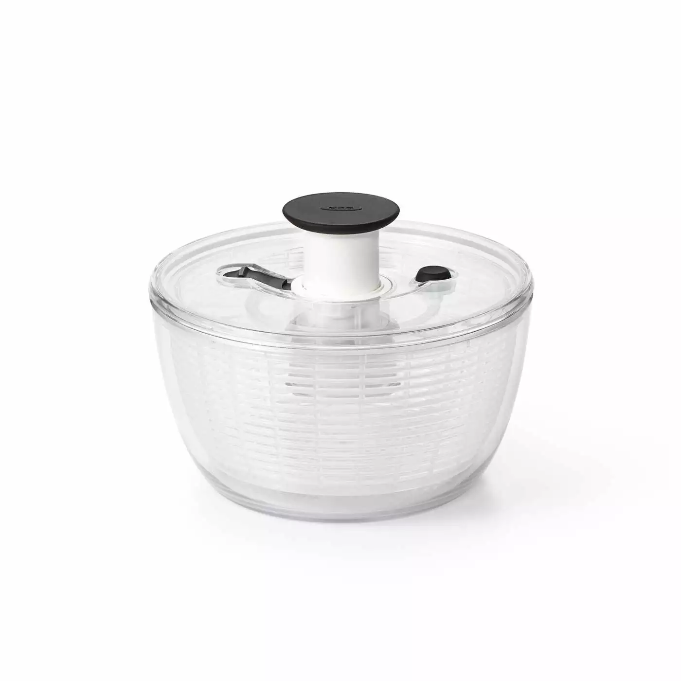 The OXO Good Grips little salad & herb spinner is the fast and easy way to dry herbs and salad leaves. Just a few presses on the plunger spins the central basket at high speed for fast salad prep. Press the ‘brake’ lever in the lid to stop the spinner completely before unloading.