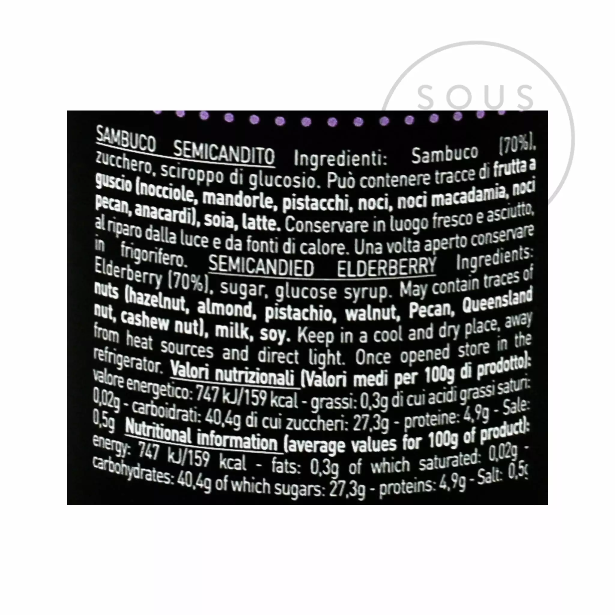 Ingredients: elderberry (70%), sugar, glucose syrup. May contain traces of nuts, sesame, milk and soy. Allergens are listed in bold.