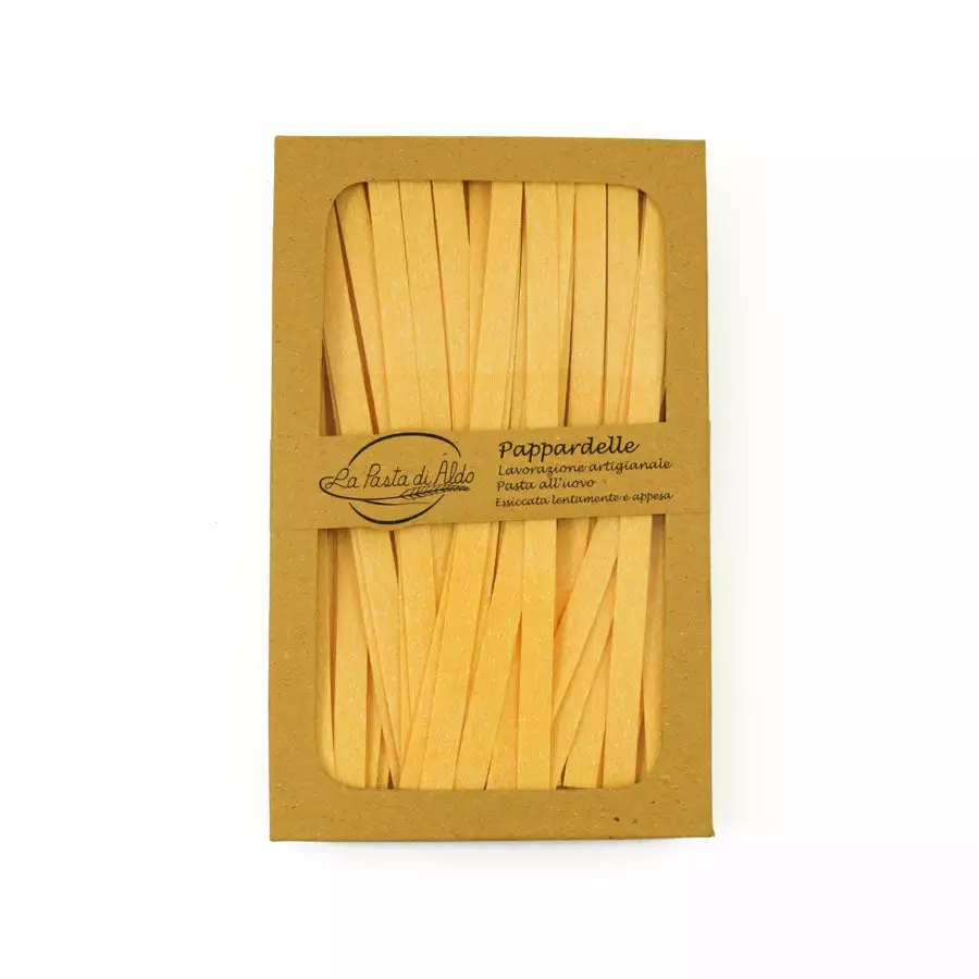 Pasta di Aldo pappardelle egg pasta has a rich and refined flavour – this is one pasta you won’t want to smother with sauce! Serve the wide ribbons simply with a little butter or high quality olive oil and black pepper, to let the flavour of the pasta shine through.