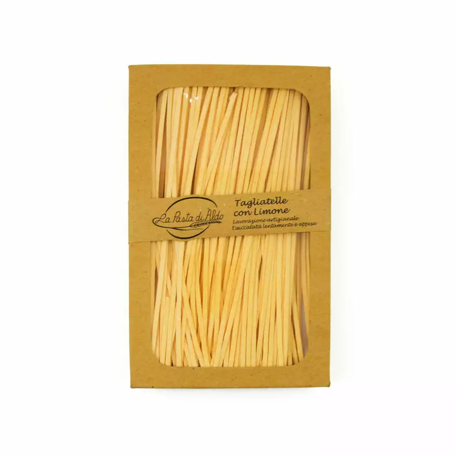 Pasta di Aldo tagliatelle egg pasta with lemon is an instant quick supper. Simply serve the fragrant pasta with a knob of butter and freshly cracked black pepper. You can also enjoy the lemon pasta with crushed garlic and black olives, or with green vegetables such as artichokes and courgettes.