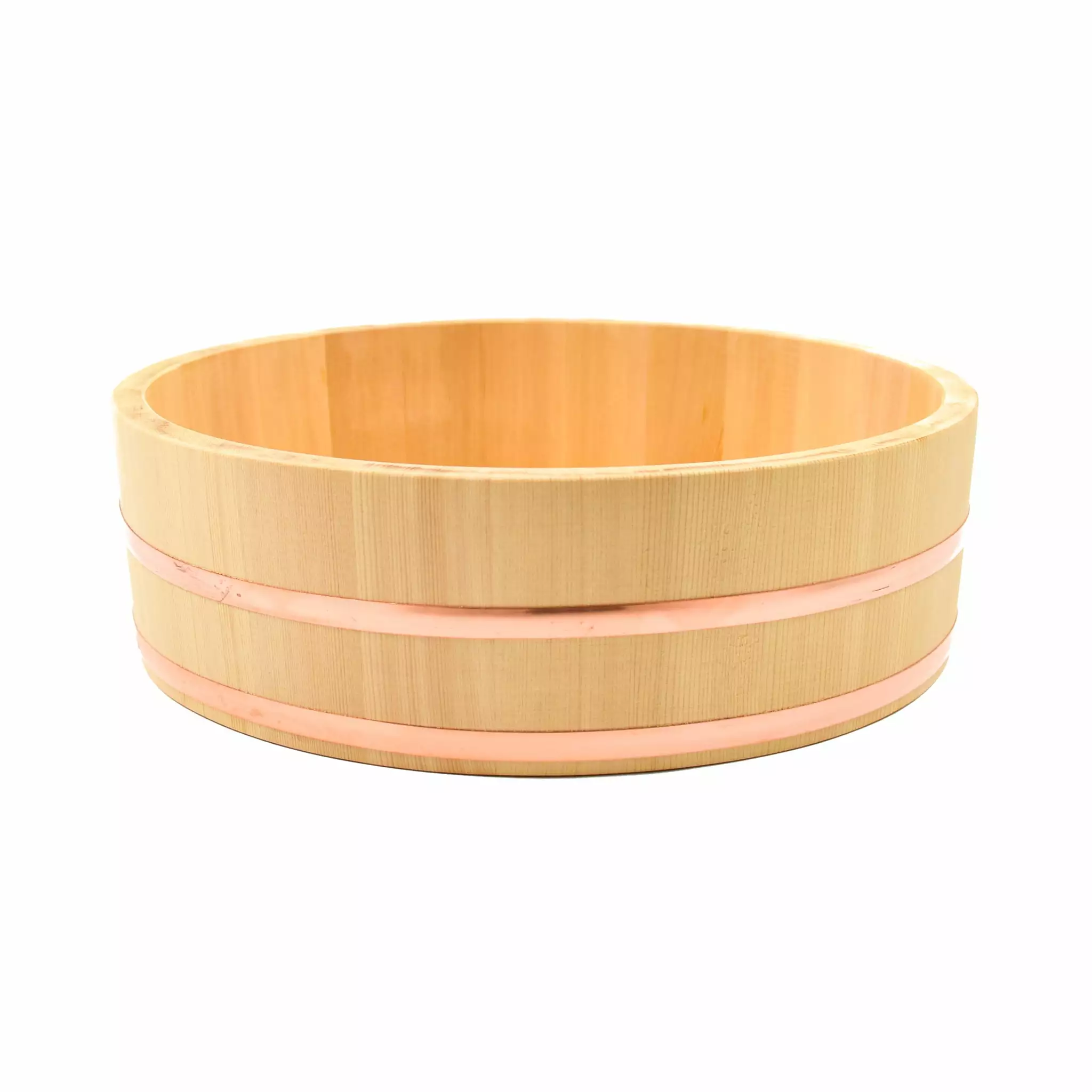 Use a paddle like the one pictured to stir and fold sushi vinegar through the cooked rice, and cover with a cloth or hangiri lid until you are ready to make sushi. This sushi barrel is bound by two real copper bands in the traditional style. A hangiri made in the traditional way from cypress wood and real copper will last even the most enthusiastic sushi chef for years to come.