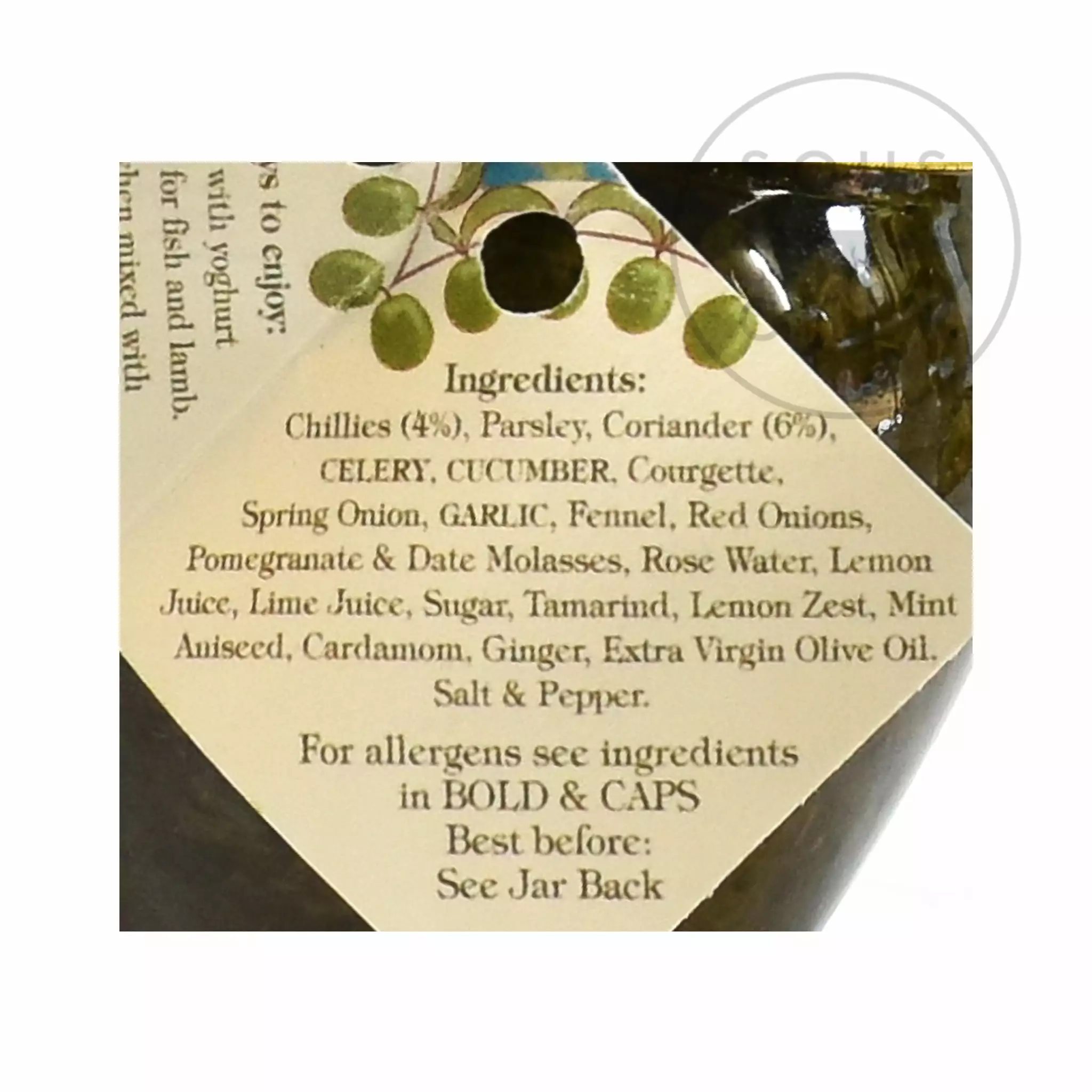Once opened top up with oil, keep refrigerated and consume within 2 weeks. Ingredients: chillies, parsley, coriander, shallots, celery, cucumber, spring onion, garlic, mint, ginger, extra virgin olive oil, salt, pepper. Contains allergens: celery.