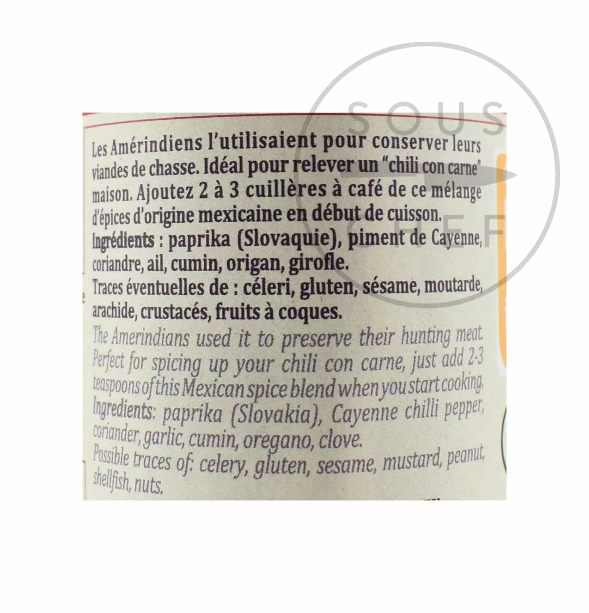 Ingredients: Paprika, Cayenne Pepper, Coriander, Garlic, Cumin powder, Oregano, Cloves.