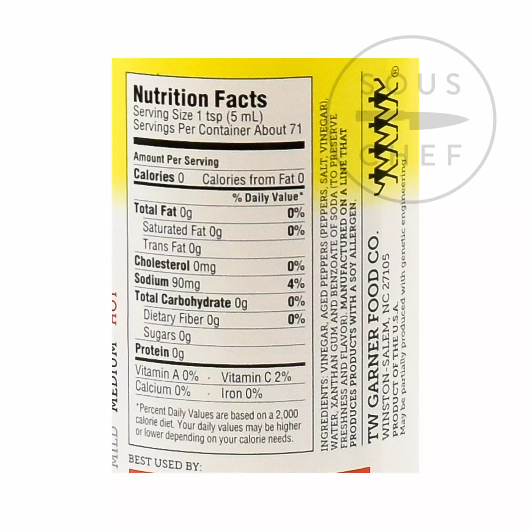 Ingredients: vinegar, aged peppers, (peppers, salt, vinegar), water, xanthan gum and benzoate of soda. Manufactured on a line that produces products with soy allergens.