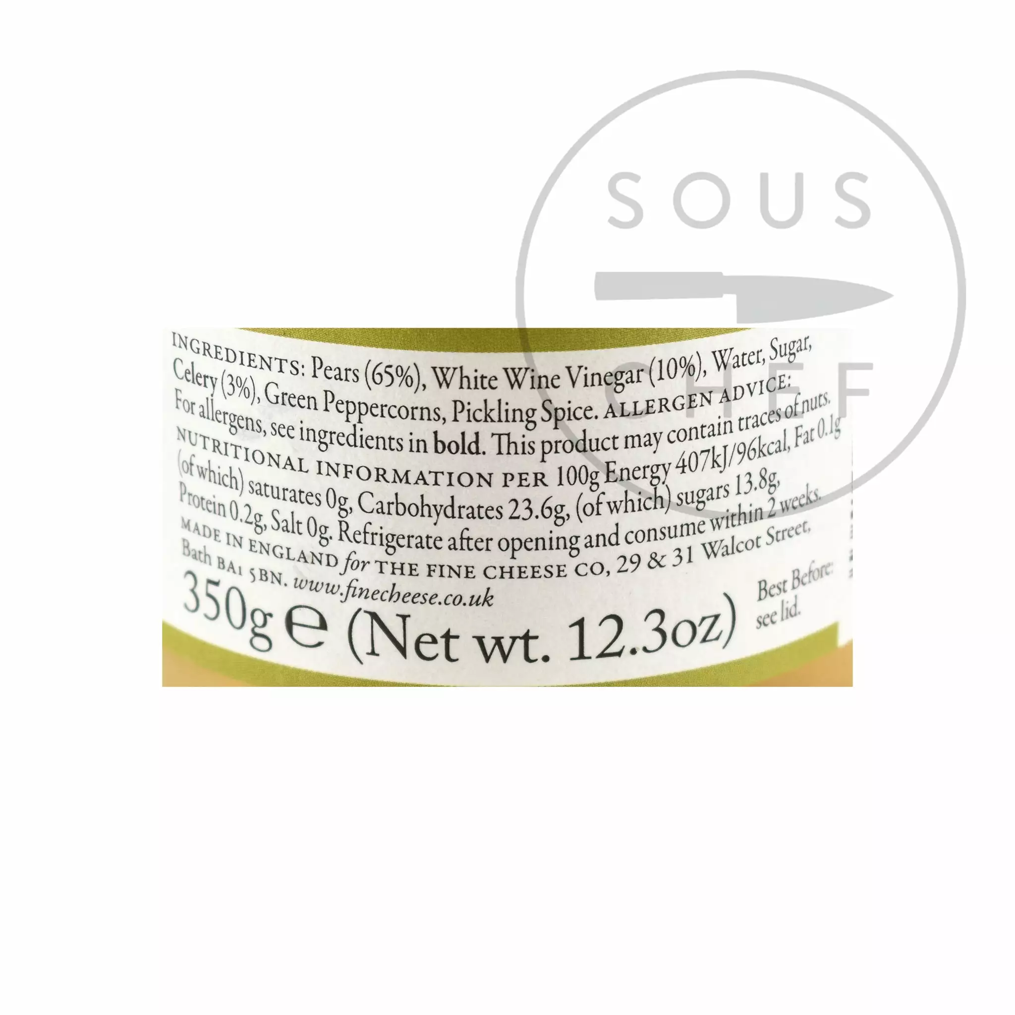 Ingredients: Pears (65%), white wine vinegar (10%), water, sugar, celery (3%), green peppercorns, pickling spice.