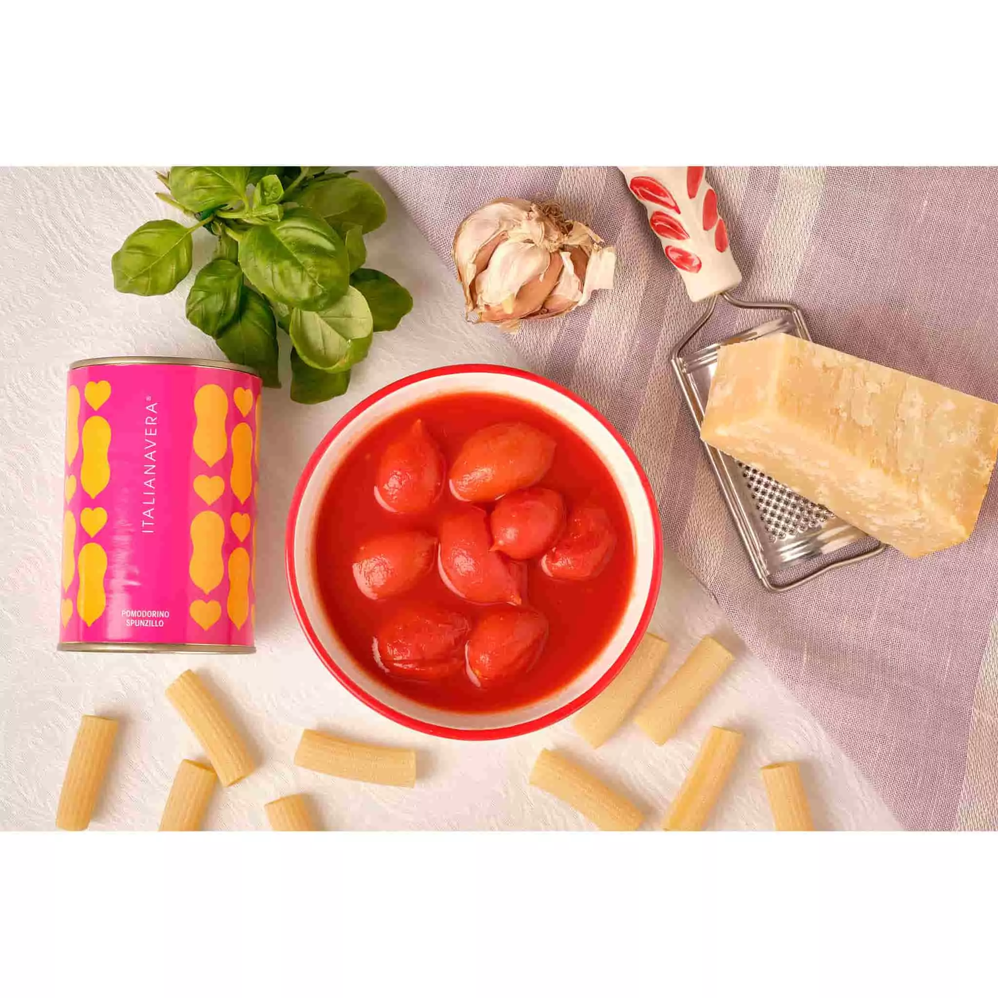 Italianavera spunzillo tomatoes are oval shaped, with a distinctive tip, sweet flavour and juicy texture. Spunzillo is an ancient name farmers gave to Piennolo tomatoes harvested in the Vesuvian area of Italy. Here, they are immersed in juice which makes that freshly picked flavour last even longer. Try using these vibrant tomatoes (that come in an equally fun tin) in a variety of ways: